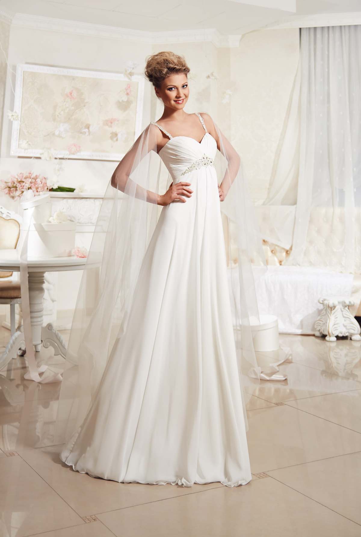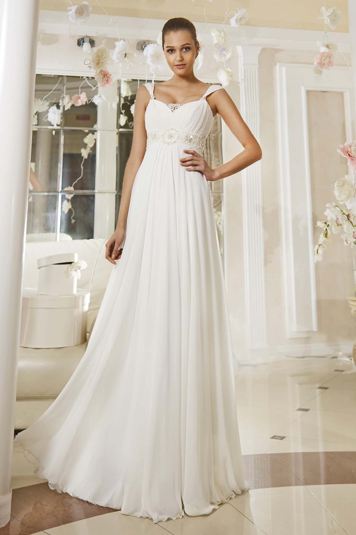 It is worth saying that the high waistline and the skirt falling on the figure are flounced in all collections. Style - universal. It fits girls in position and those who prefer not to focus on the figure. It is convenient for an exit ceremony and is suitable for a simple celebration.