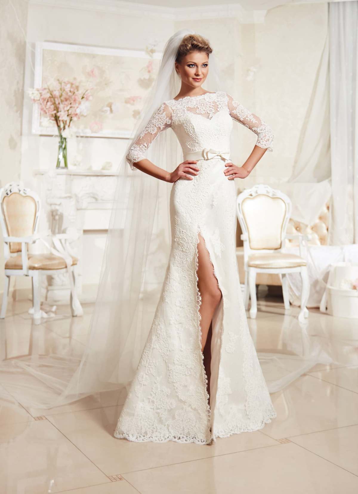The collection includes dresses of all styles. However, they have an unusually high waist or a cut on the skirt of the dress. Lace sleeves and a rich belt remain the main accents of the images in this line of wedding dresses from Eva Utkina.