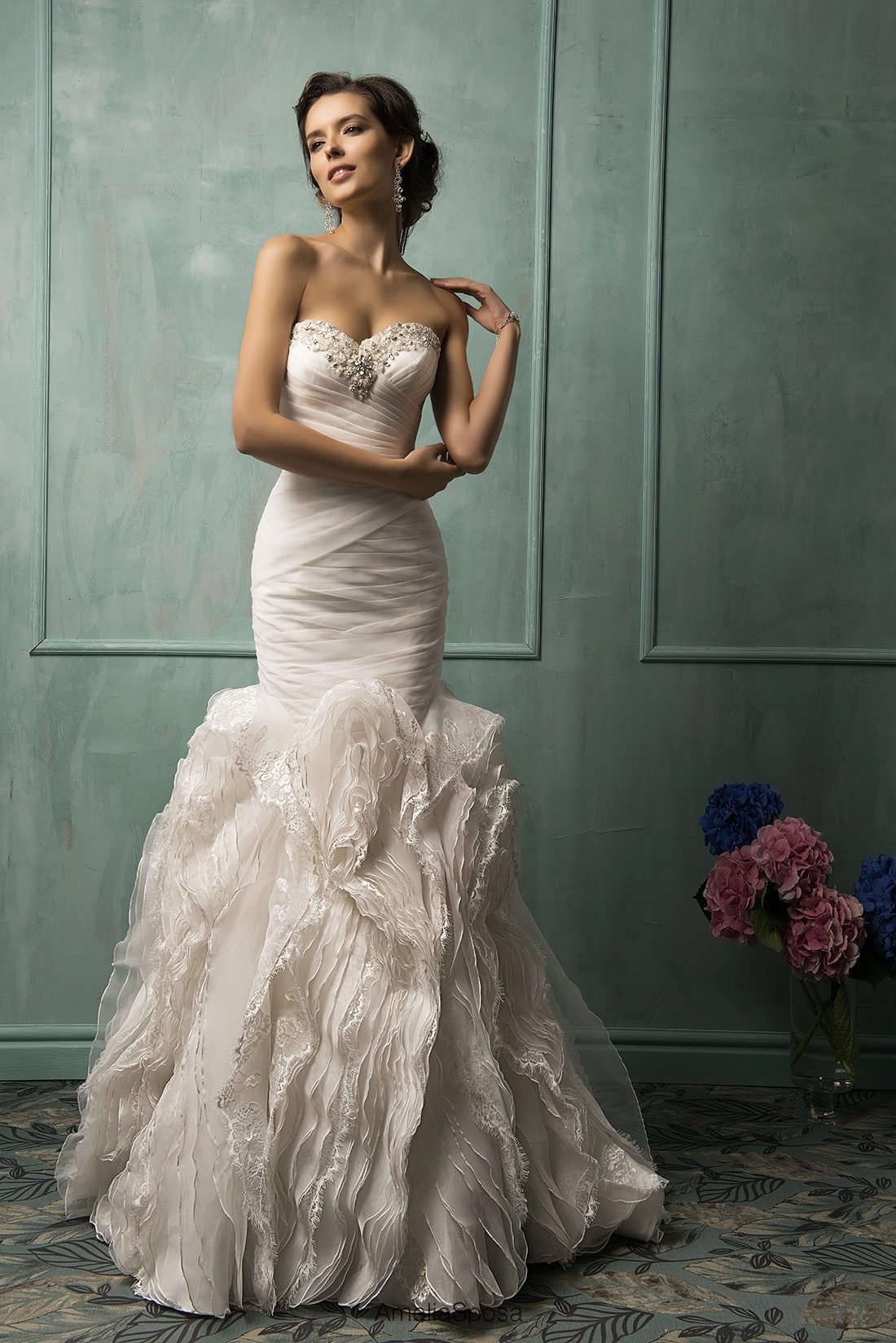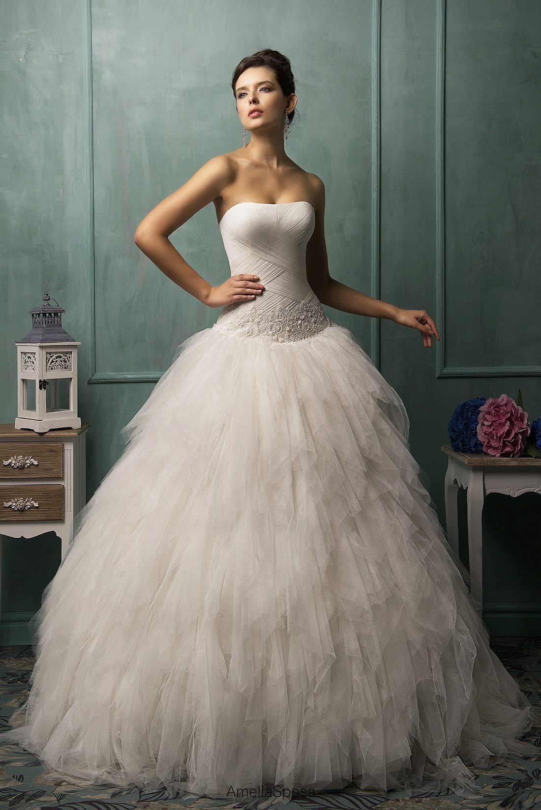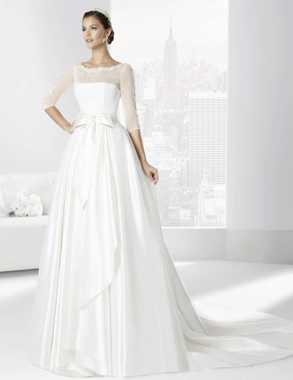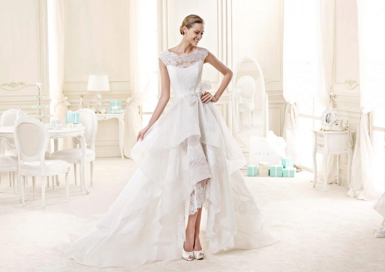 Each bride will find traditional dresses with unusual elements, topical outfits with length at knee level, models with basques and many other things. Designers use corsets, bead embroidery and pearl threads.