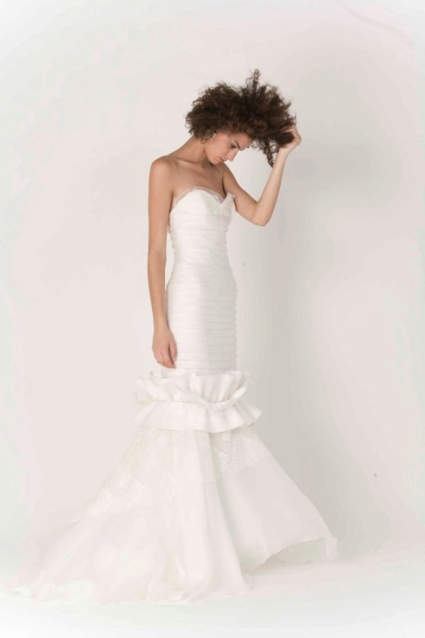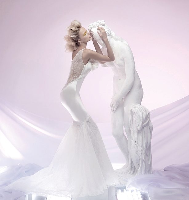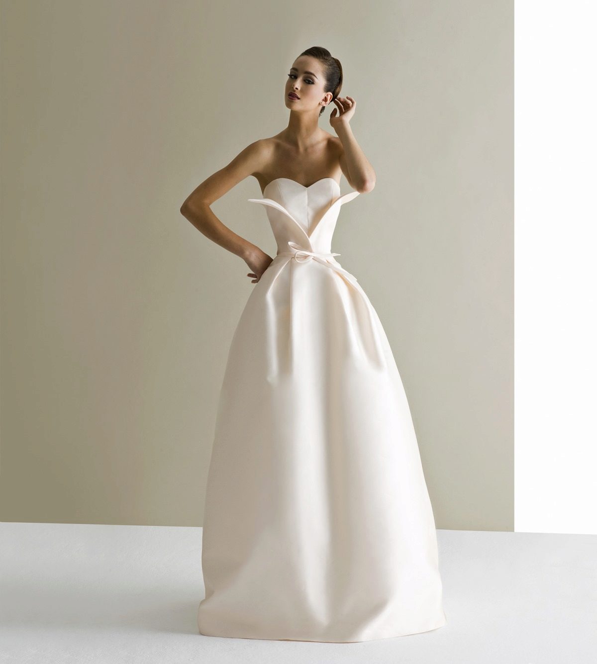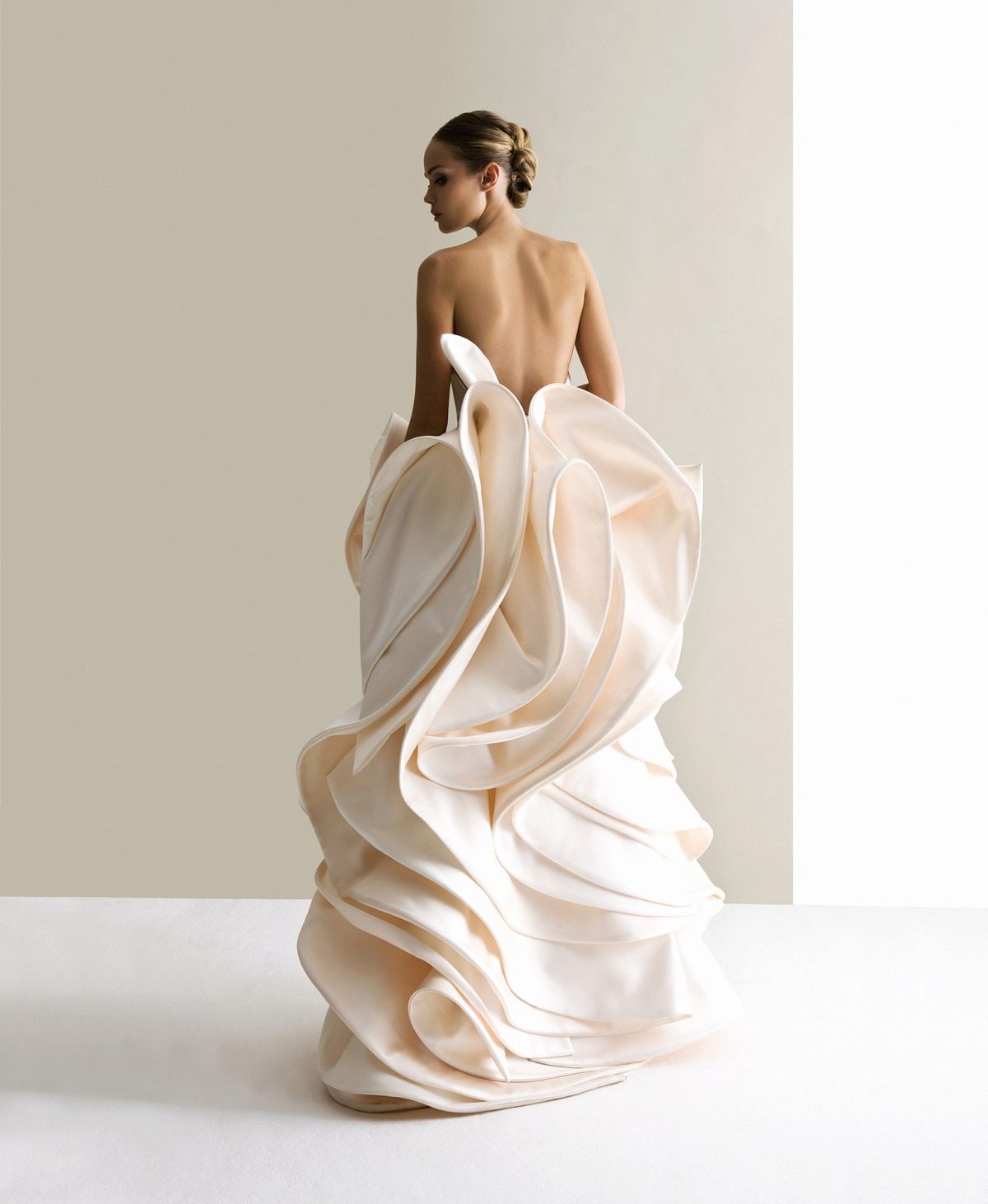 Franc Sarabia is associated with smooth silk, so beautiful that it does not even need finishing, and the thinnest lace that can be found in the world. A lot of dresses are created with bare shoulders and back, deep cleavage and very, well, just very long trains.