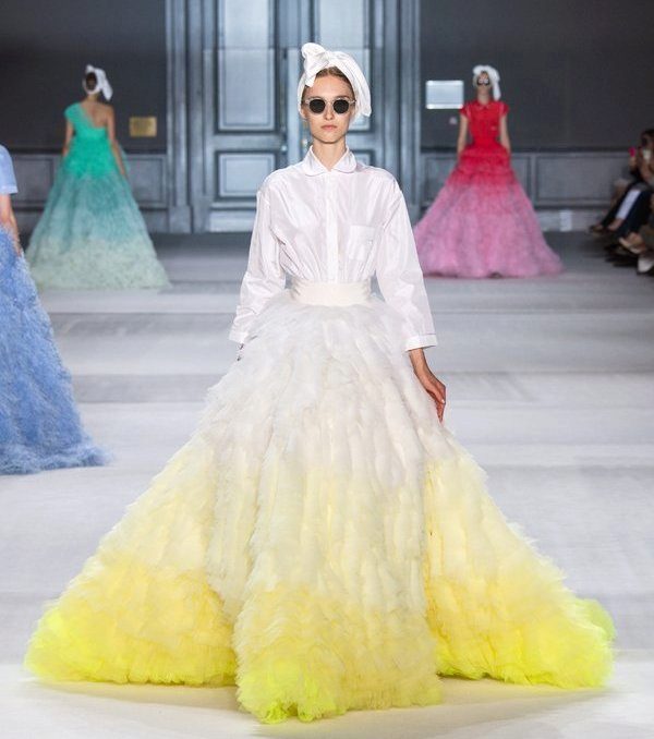 The crazy combination of opposing styles and forms has earned the admiration of the public. Another model that turned the fashion critics upside down was distinguished by a large number of colors concentrated on the skirt and corset.