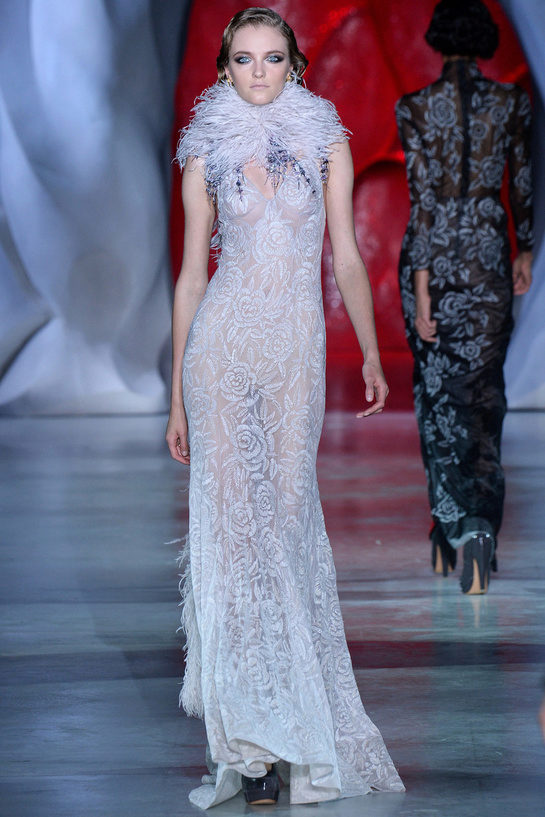 The main materials were selected neoprene crepe, gold sequins, beads and the innovative design of a fashion house - pieces of Corbusier cement. The collars on the dresses are trimmed with gold patterns, which are displayed in the embroidery.