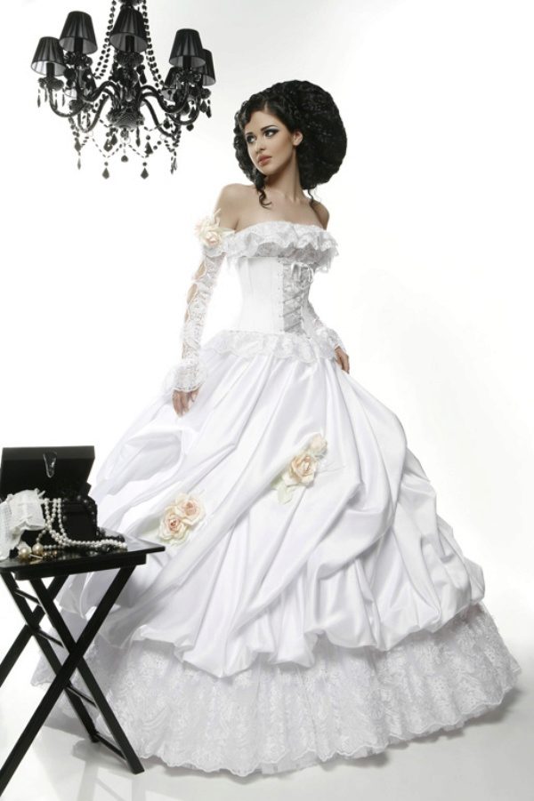 For sewing dresses from this collection was spent a huge footage of classic fabrics - satin, lace, satin, taffeta, mikado.