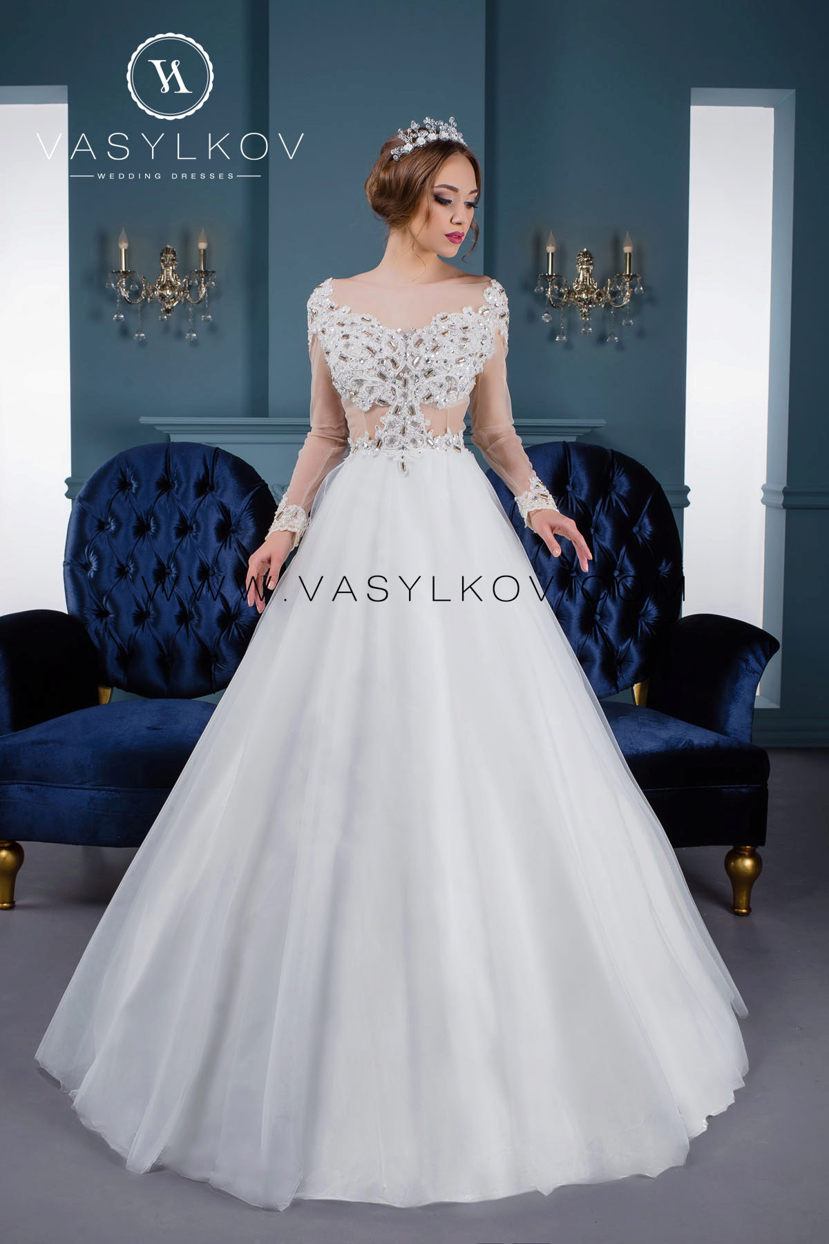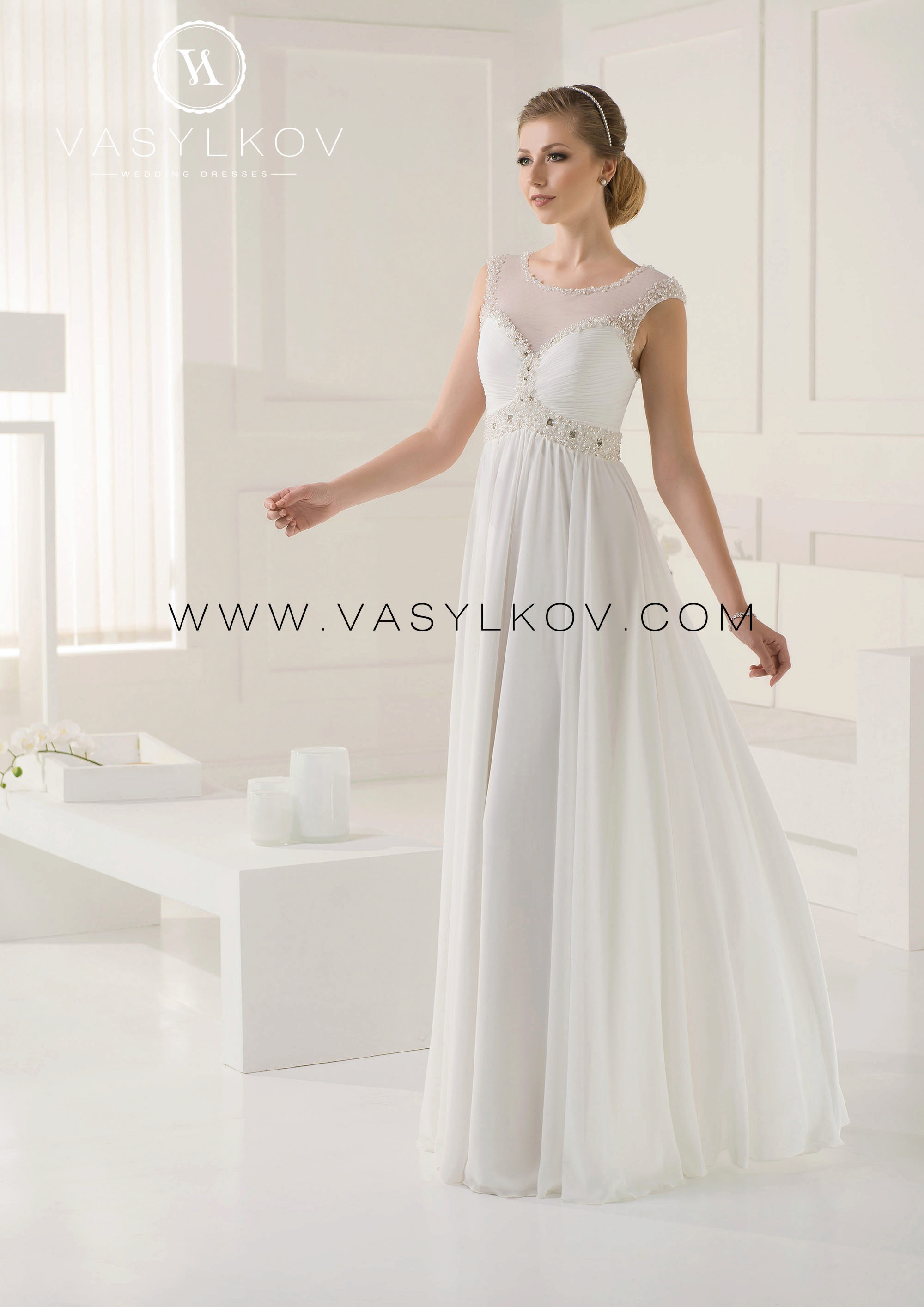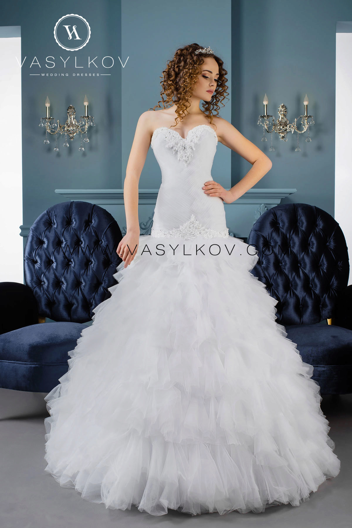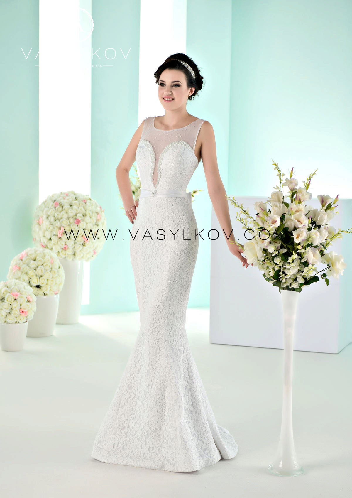 Previously, there were many models in which the veil was not provided for and the bride was free to decide for herself how desirable the presence of this element was for her. Now, the Vasilkov brand has made a veil an obligatory element in an image, making it of medium length (slightly below the waistline). Although if this length seems inconvenient to you, you can use a large selection of short head ornaments that the veil serves.