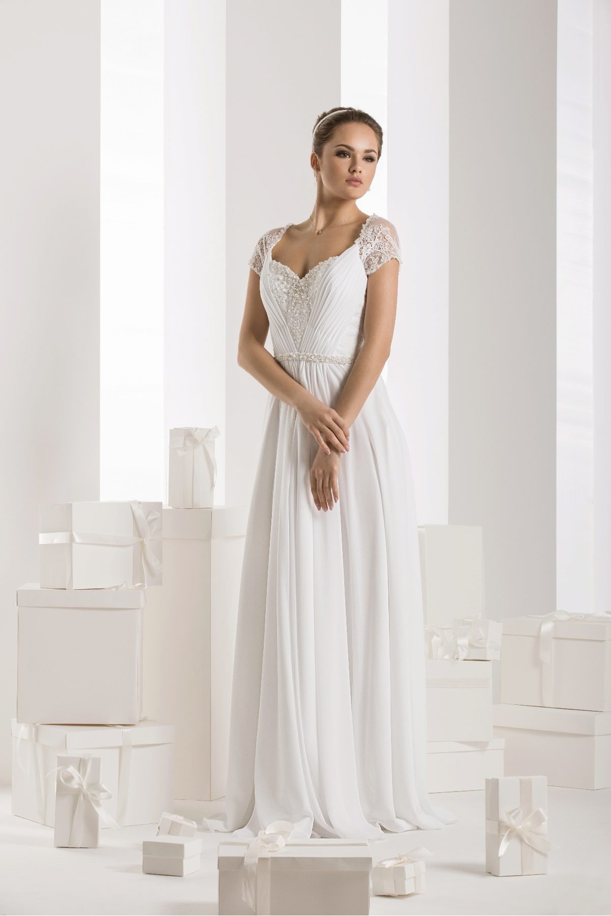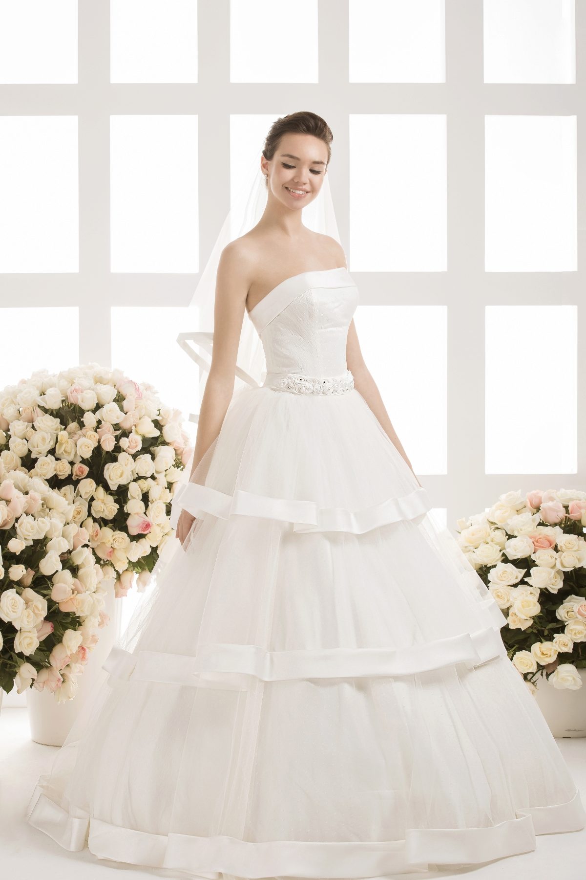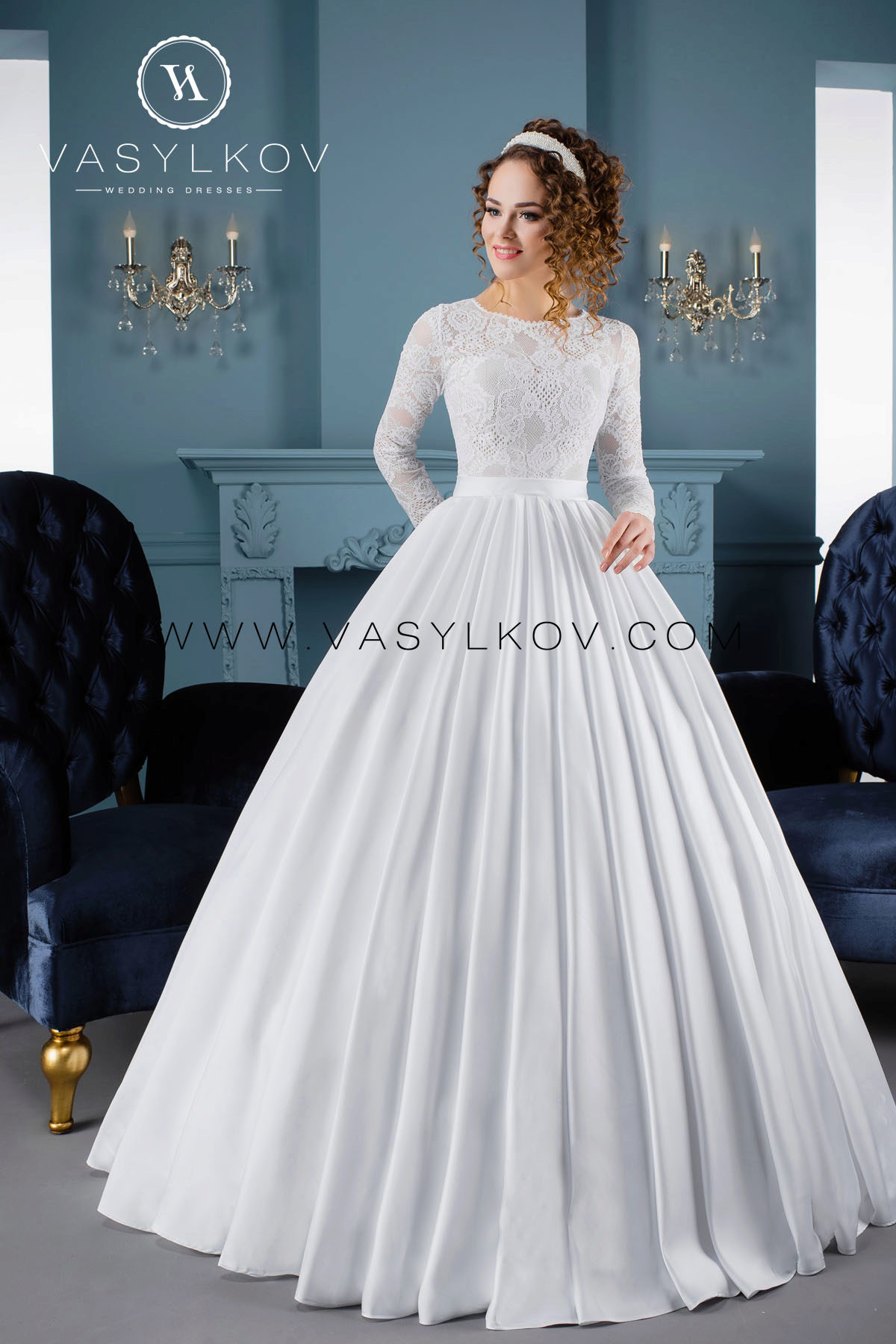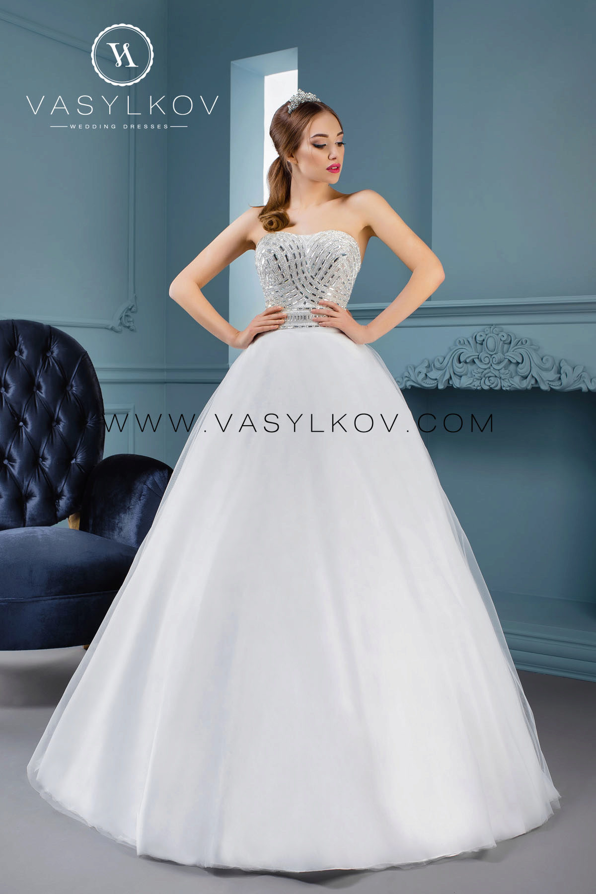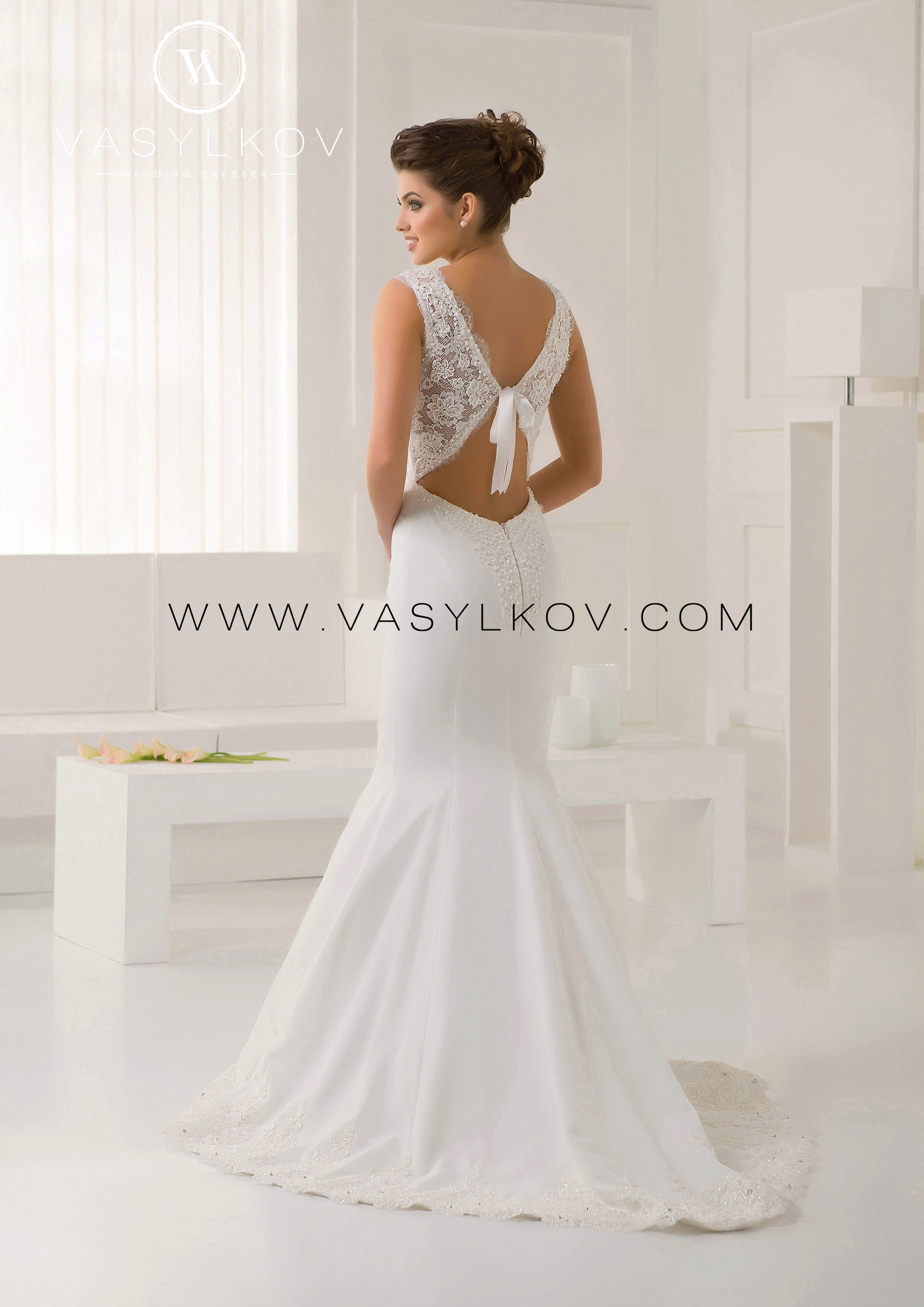 Previously, there were many models in which the veil was not provided for and the bride was free to decide for herself how desirable the presence of this element was for her. Now, the Vasilkov brand has made a veil an obligatory element in an image, making it of medium length (slightly below the waistline). Although if this length seems inconvenient to you, you can use a large selection of short head ornaments that the veil serves.