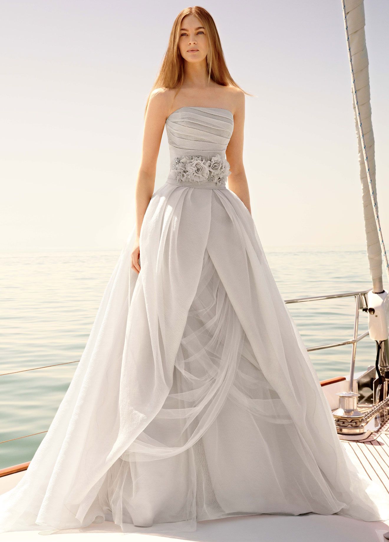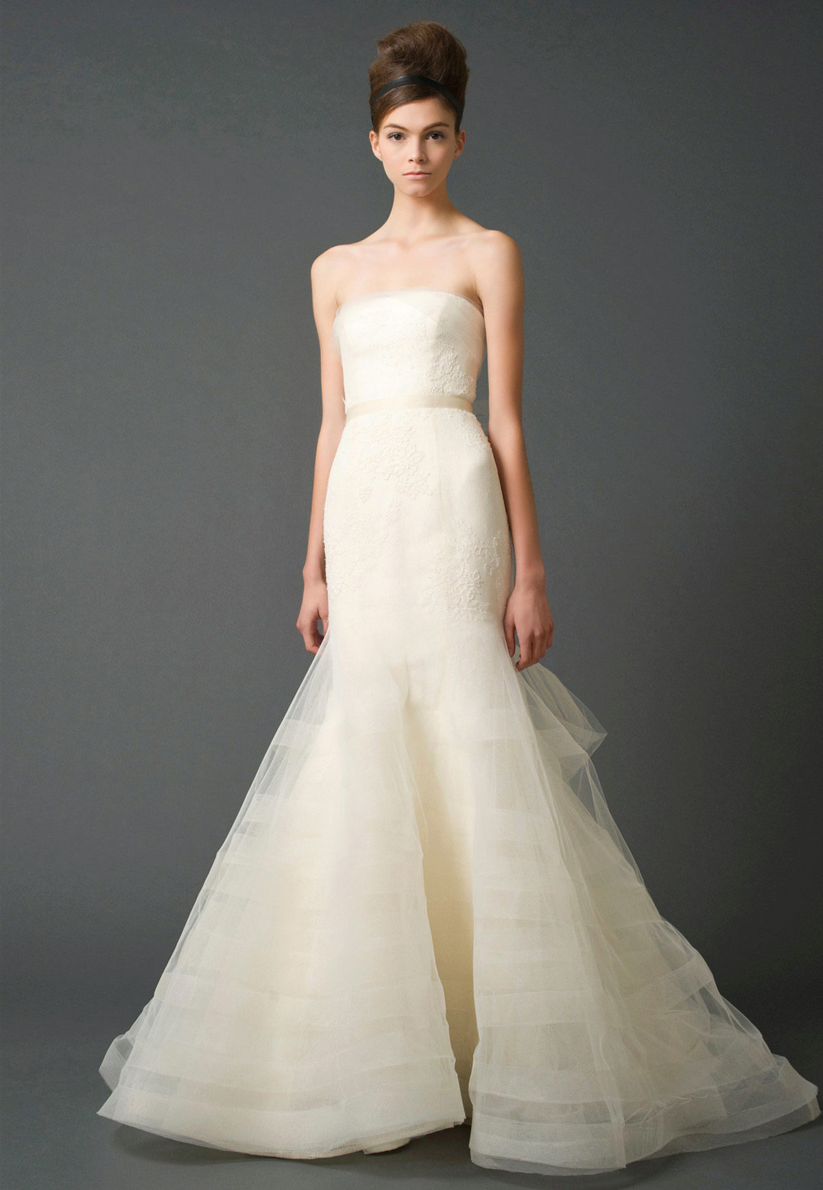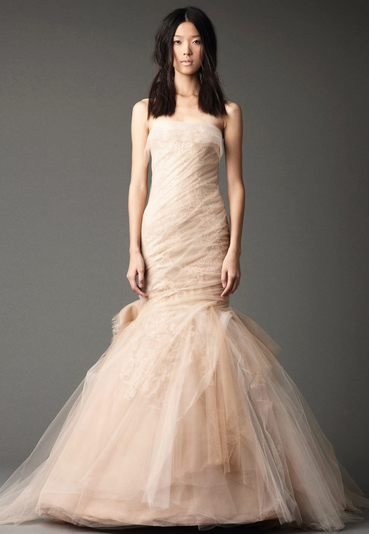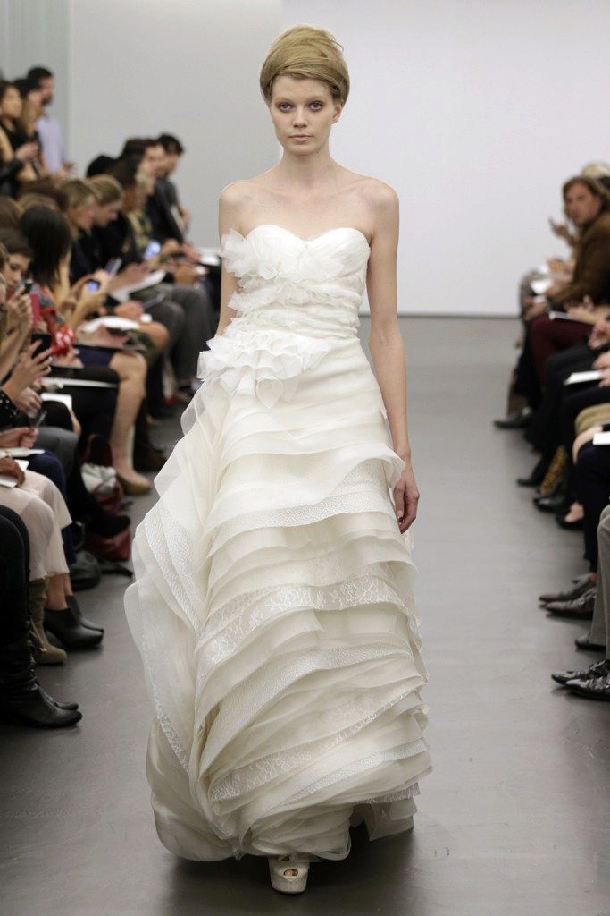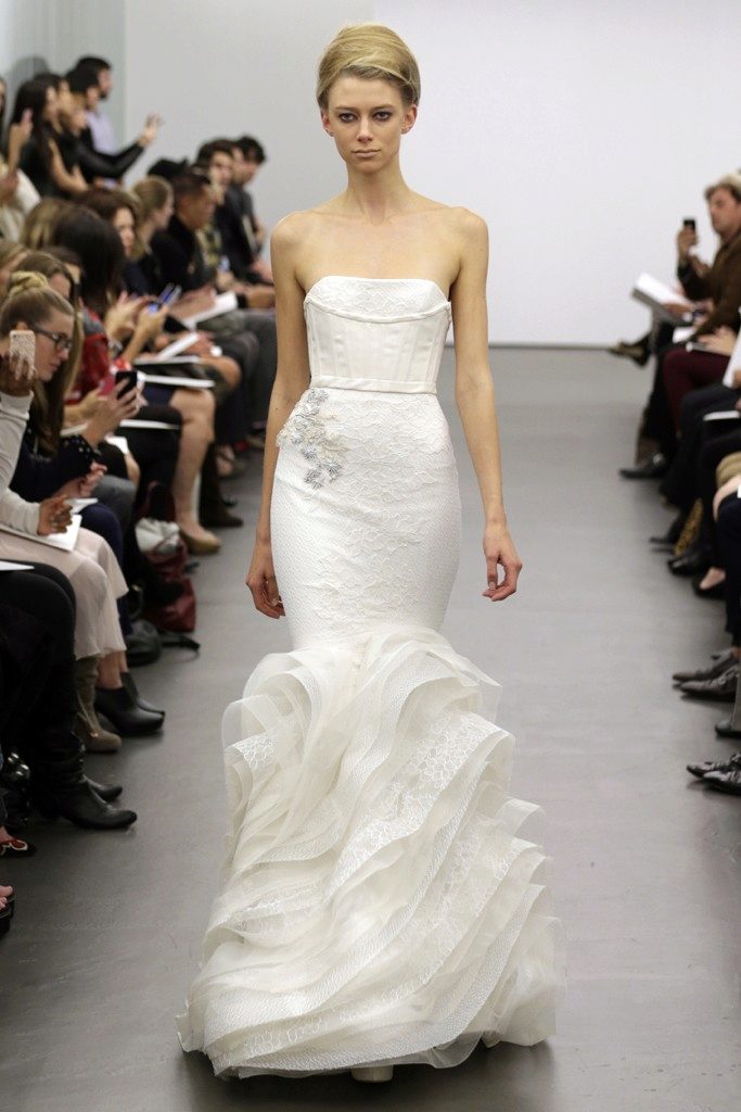 Vera Wong used flowing lines, delicate lace and white. This beauty is difficult to describe in words, it is better to see photos of models.