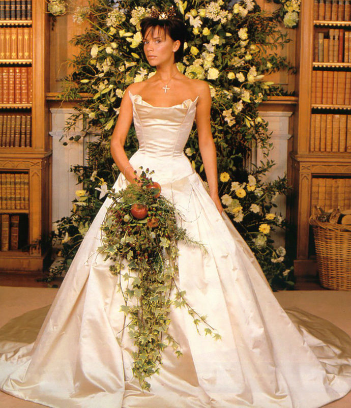 Star brides often turn to Vera Wang for exclusive outfits. Initially, Vera was popular in America, but after the wedding of Victoria Beckham, who also used the services of a designer, they talked about the talent of a fashion designer in England. The whole world was admiring a ivory satin dress, in which the bodice did not have a strapless, and the skirt was lush and turned into a chic train.