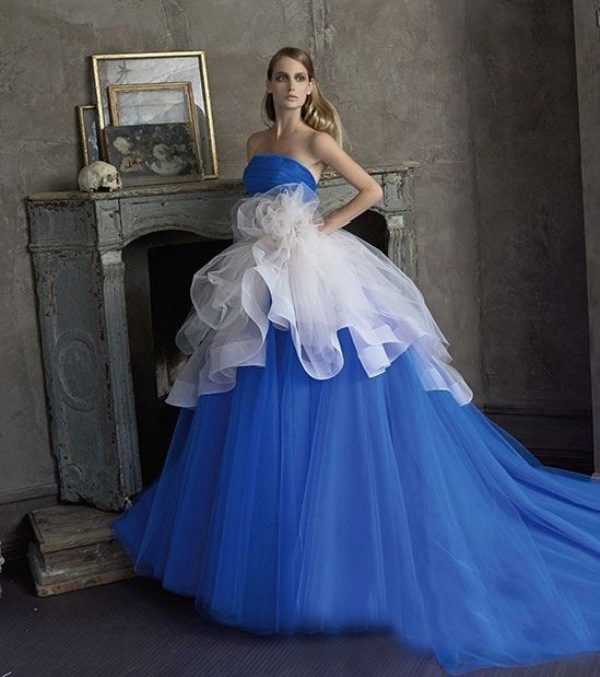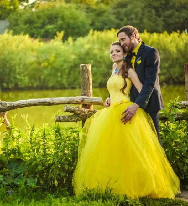 A colored model of a wedding dress in saturated colors can be of any style, made from any material and have different lengths. Sophisticated fit is not required. Often a simple dress in bright color looks great.