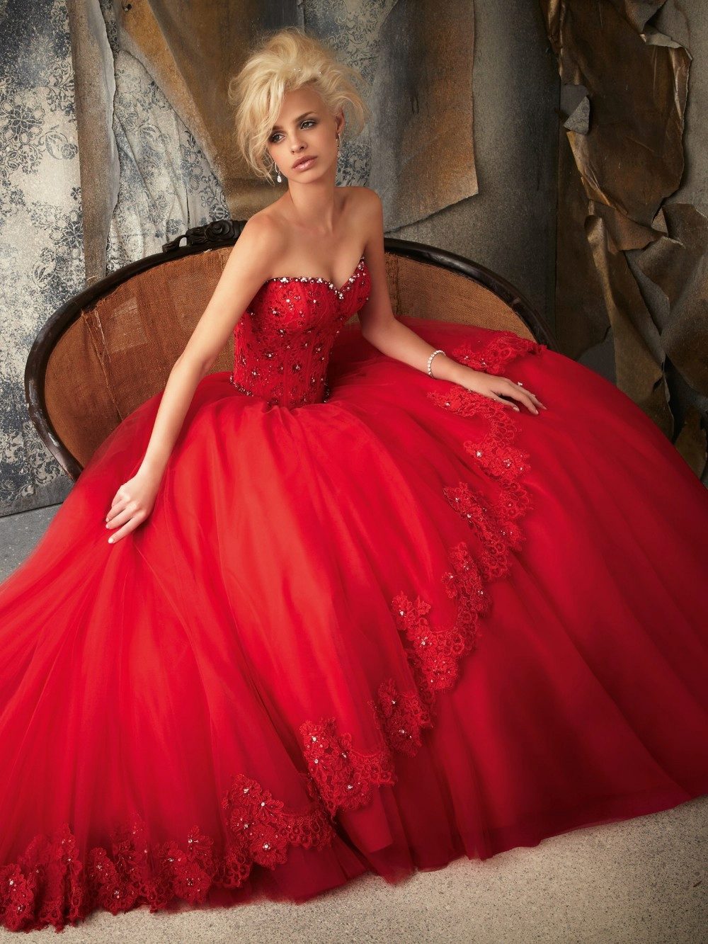 Precious metals were valued always and everywhere, so it is hardly surprising how elegant and rich wedding dresses made in gold and silver shades look. With a metallic sheen, the fabric shimmers in the light. The perfect complement is sophisticated drapery and patterns.