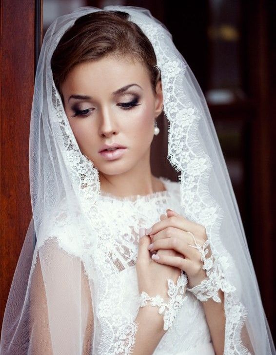 Veil or caps can be a beautiful accent. When using active headgear it is better to abandon elegant and bright jewelry on the neck or hands.