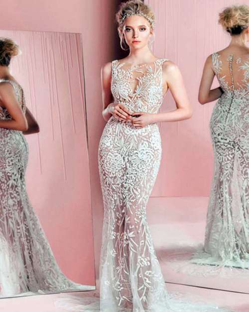 Openwork and translucent fabrics are combined with dense materials to emphasize the beauty of the bride, to make her image mysterious and beautiful.