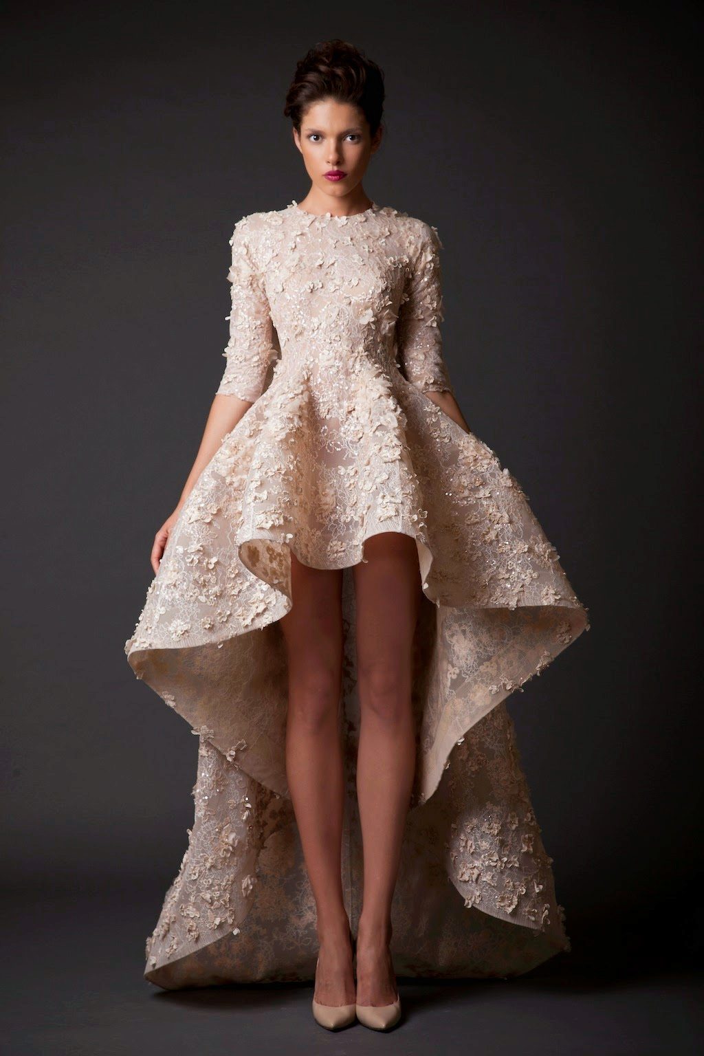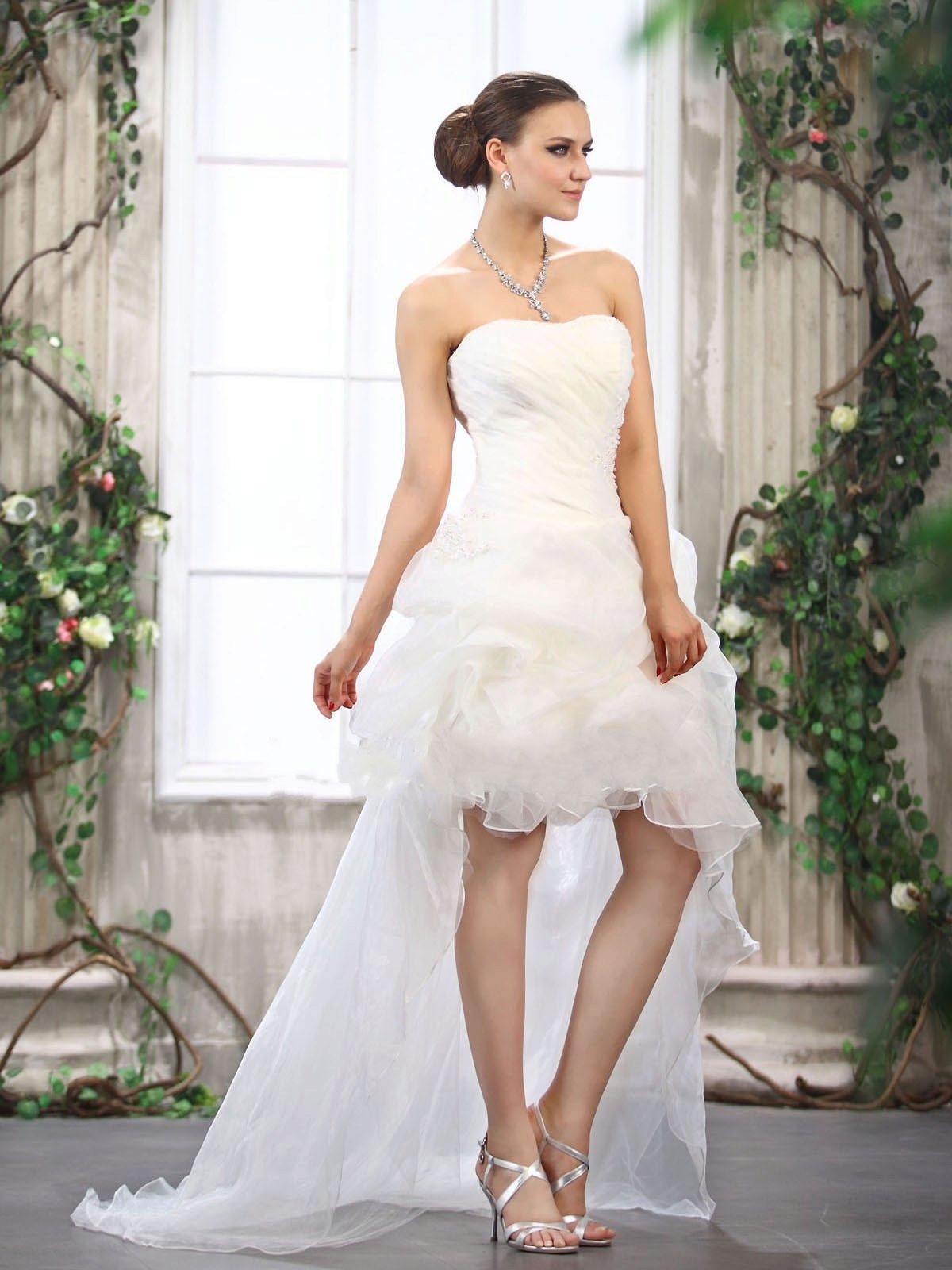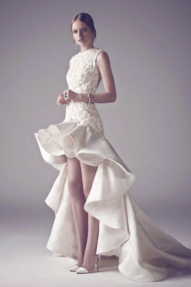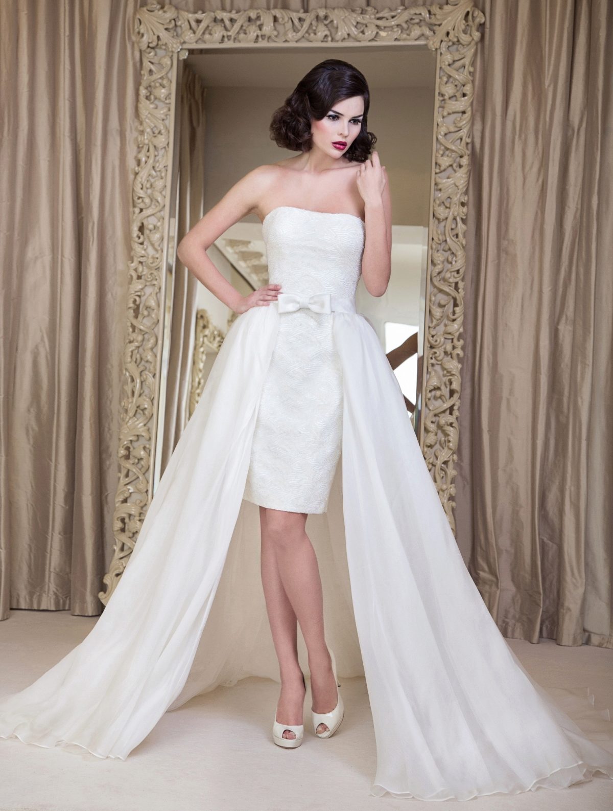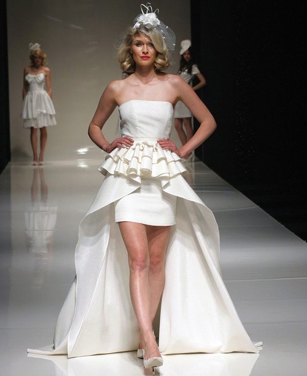 A short dress with a skirt smoothly flowing into the train can give a special matchlessness. In other words, the train and dress are one. Therefore, it can not be removed. Short in front and long in back, dress visually pulls the figure, giving elegance and sophistication to the image.