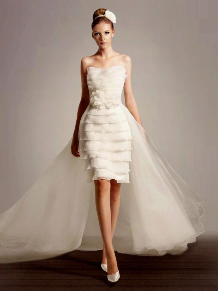 - The main feature of a short dress with a train is its versatility, convenience and originality. Dress can be worn after the wedding day. It will benefit you at a party or at an official reception.