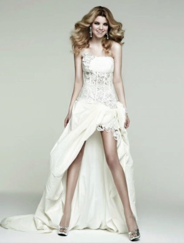 - The second criterion is slender and long legs. Undoubtedly, the image of a slim bride with beautiful legs in a short wedding dress with a train will look in a very advantageous light. Unusual hem will be a key factor that attracts the eyes of the newlywed, and the original hairstyle will fade into the background.
