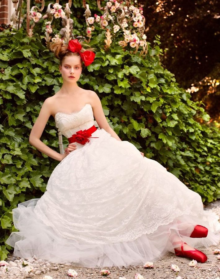 The combination of white and red perfectly symbolizes passion and tenderness in one bottle. You do not need to choose a two-color wedding dress, just enough to combine the colors. For example, a spectacular decision would be to purchase a wedding dress with a red belt.