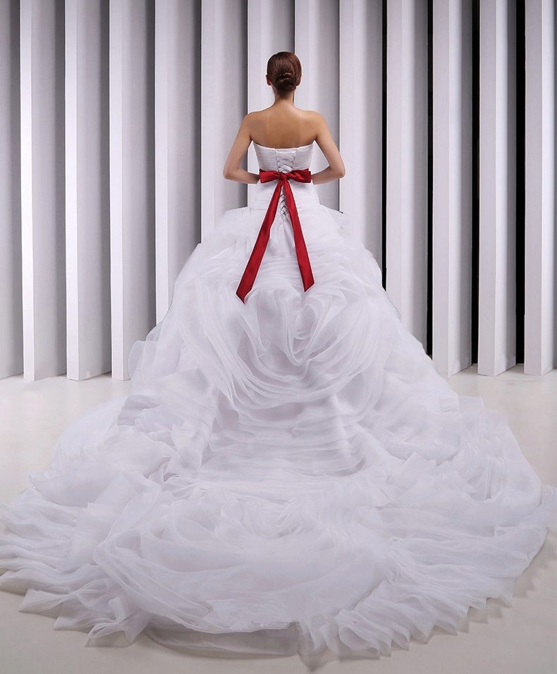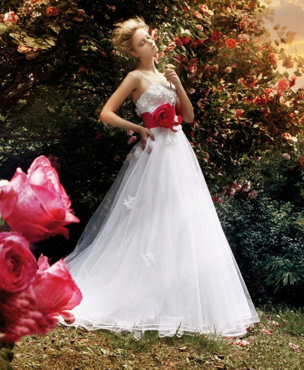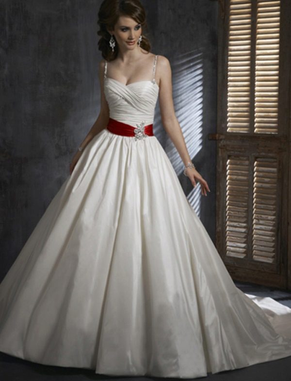 A wedding dress with a red belt is the choice of a modern, courageous girl, who is perfectly able to place accents and create completely unique images. This decoration allows you to adjust the shape, to create a silhouette of an hourglass type, as well as to emphasize advantages.