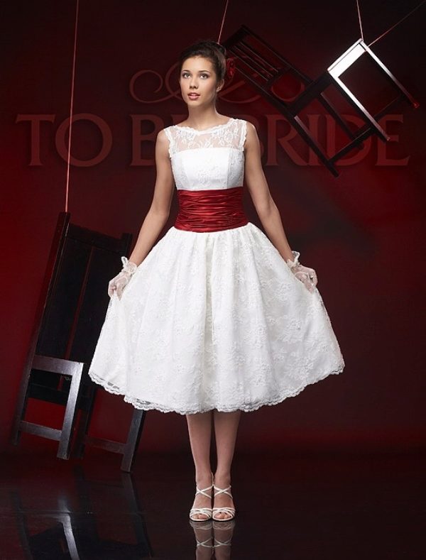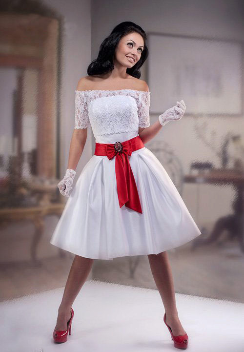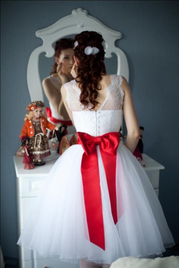 Pretty popular short dresses for weddings. They allow you to visibly open beautiful legs, and the red belt will be the highlight of this outfit. For open knees, the bride will be especially grateful in the hot summer, when she does not have to sweat.