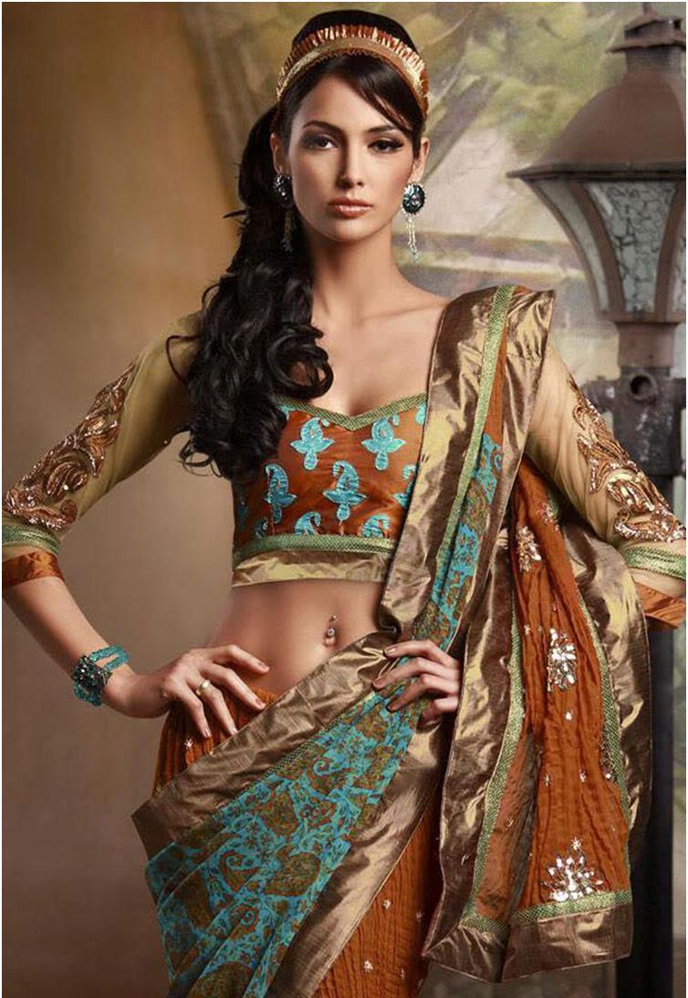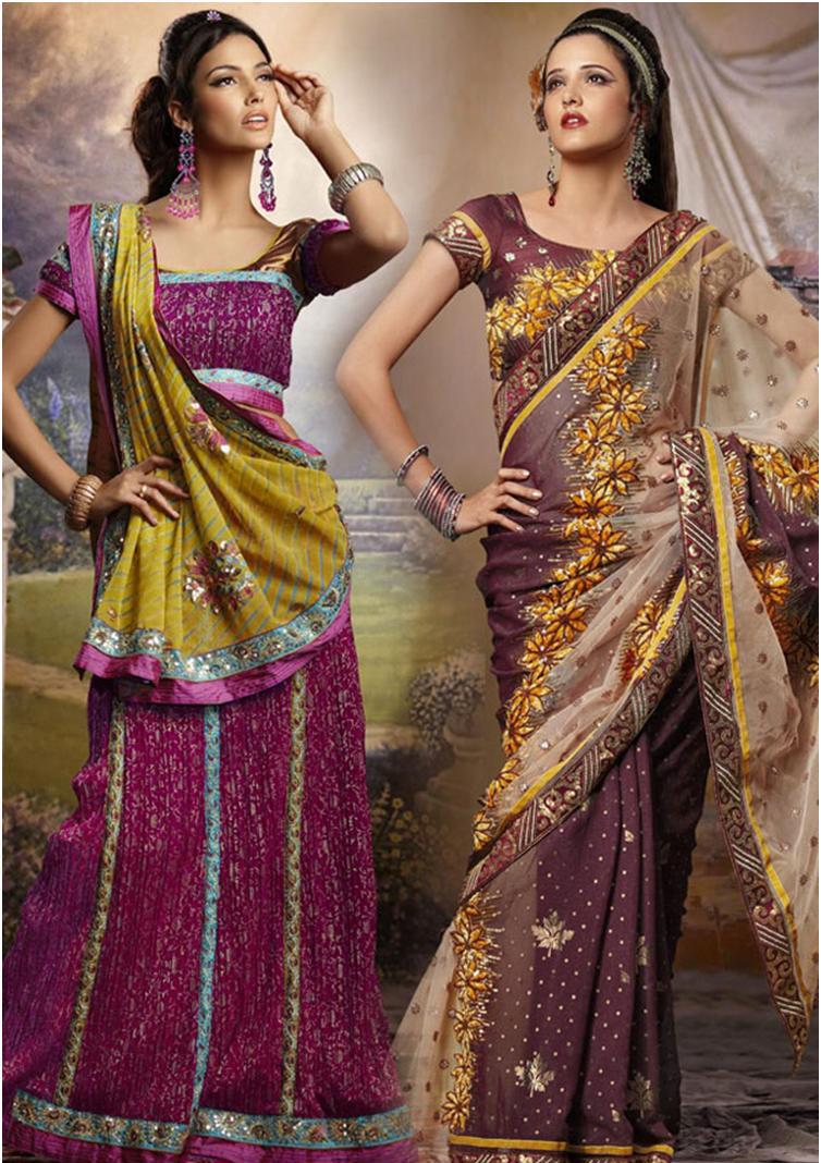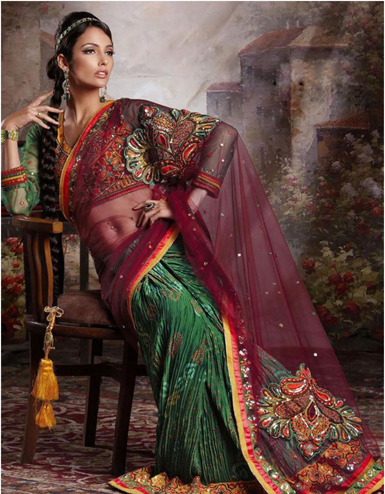 Dresses from fashion designer Shanaiya from India prefer lovers of the exotic. Wedding saris are made in strict accordance with Indian philosophy. The ravik blouse and the skirt-shaya are made of the finest silk of red or green color. Clothes can be supplemented with a cape of chiffon burgundy or mustard tones. Along the edges, embroidery of ornaments with glitter and gilded foil is made.