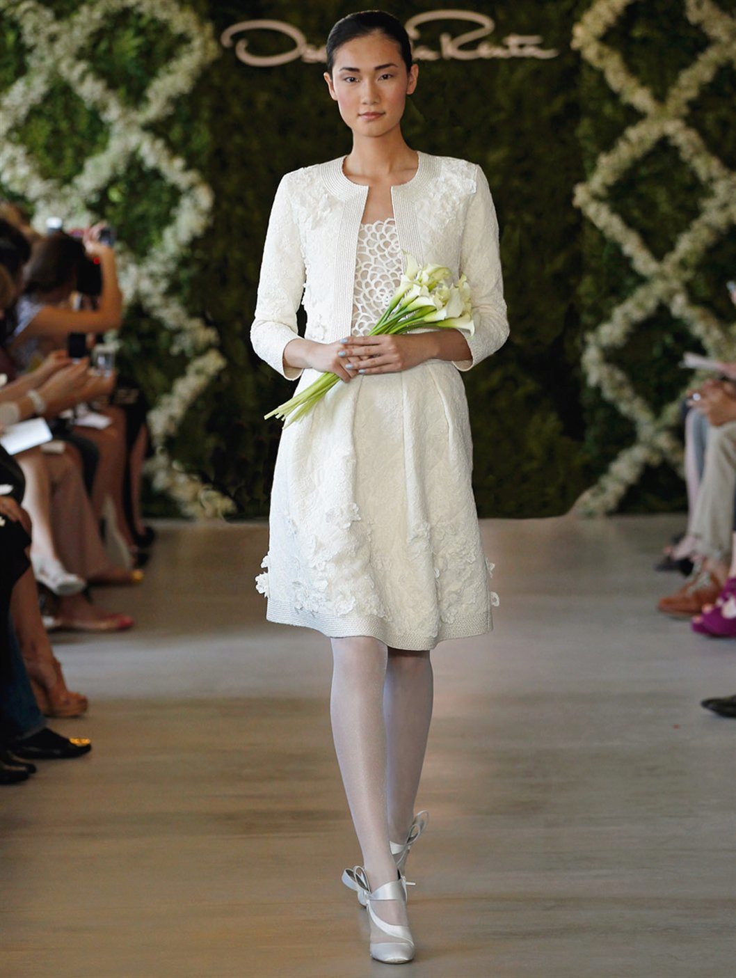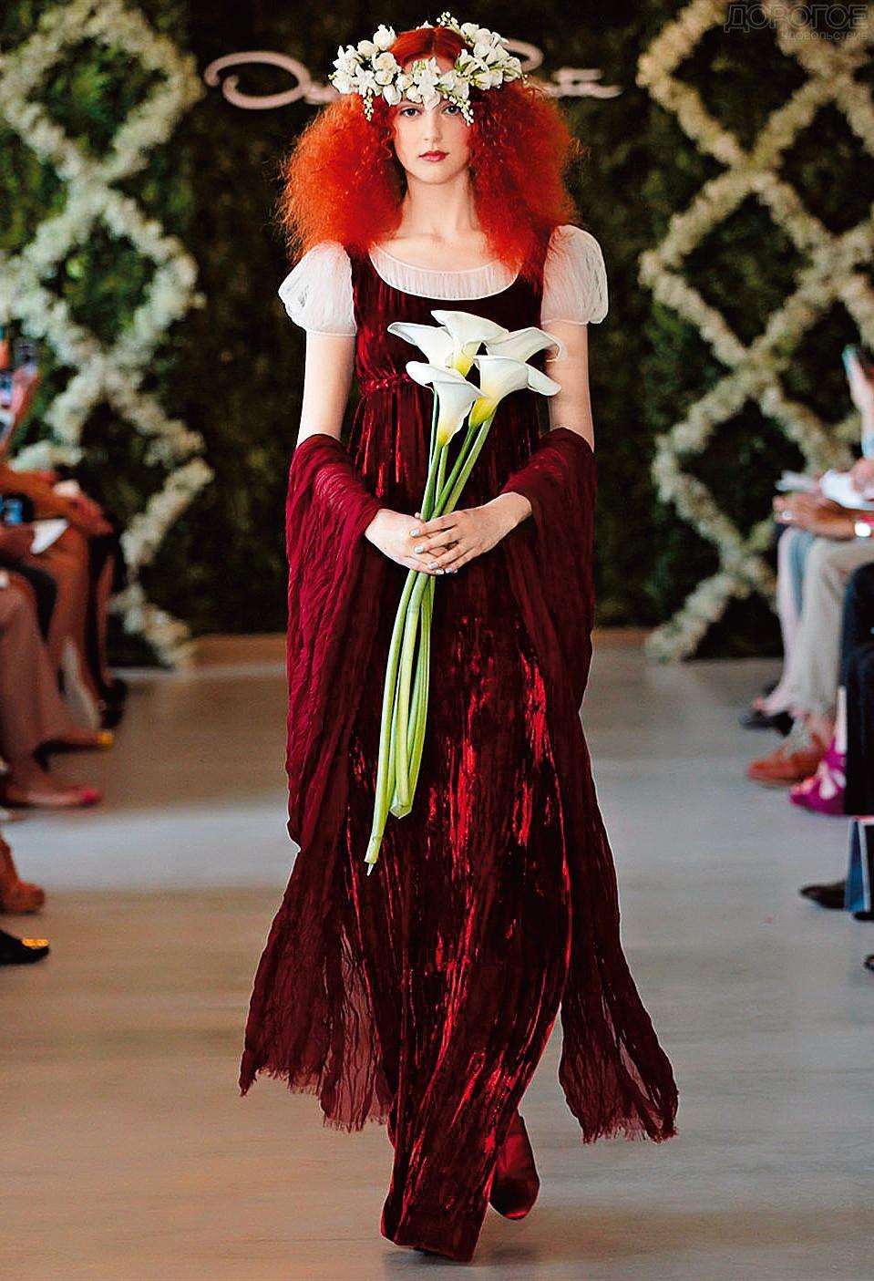 Examples of original wedding dresses can be found in the collections of any fashion designers. So, in addition to traditional dresses, Oscar de la Renta pleases brides with suits with short jackets and skirts, short tops and bold trousers. Fashion designer experimenting with styles and color gamut. Snow-white tones smoothly turn into red, gently blue and burgundy. The main "chip" of clothes from this designer can be called conciseness. No extra details, only refinement, sophisticated fit and color play.