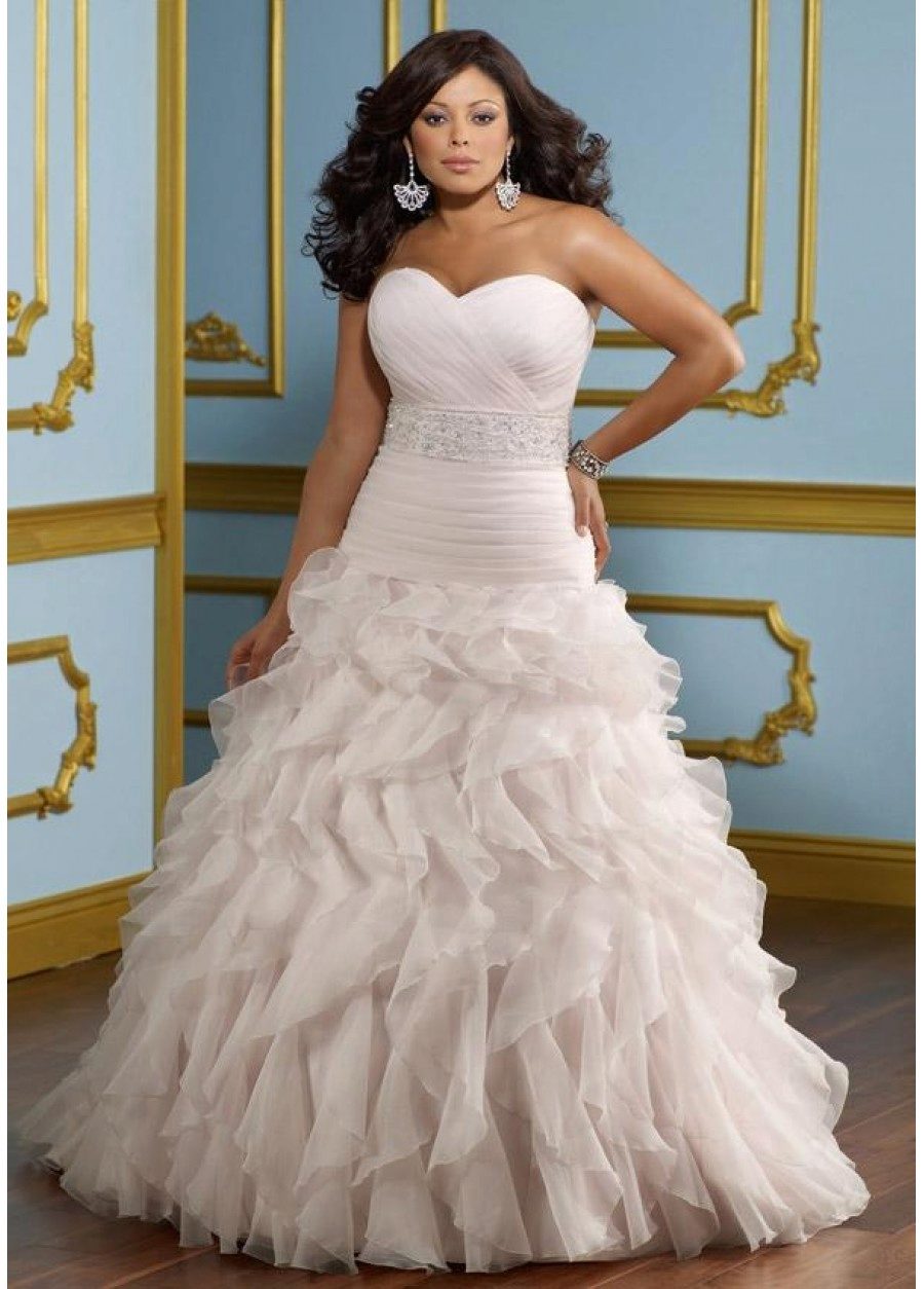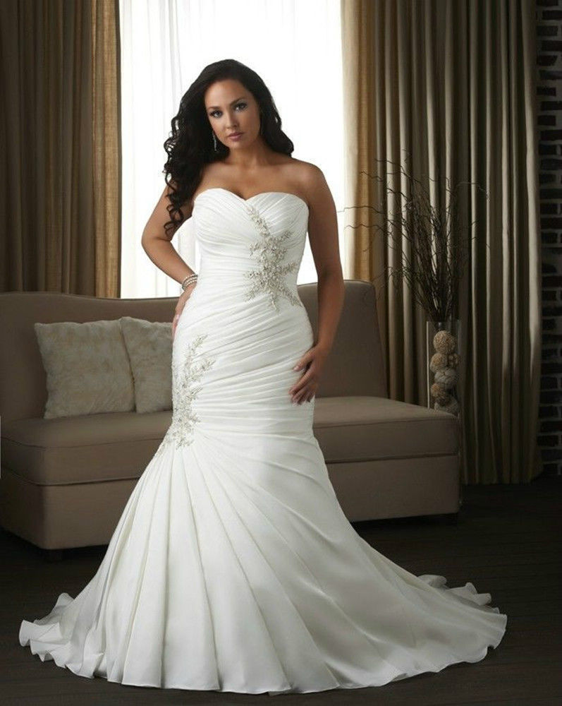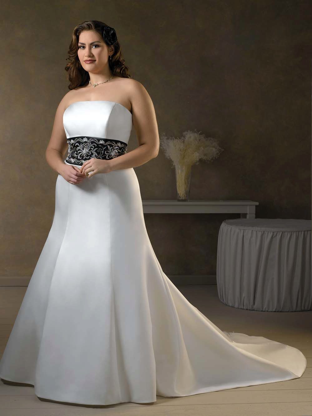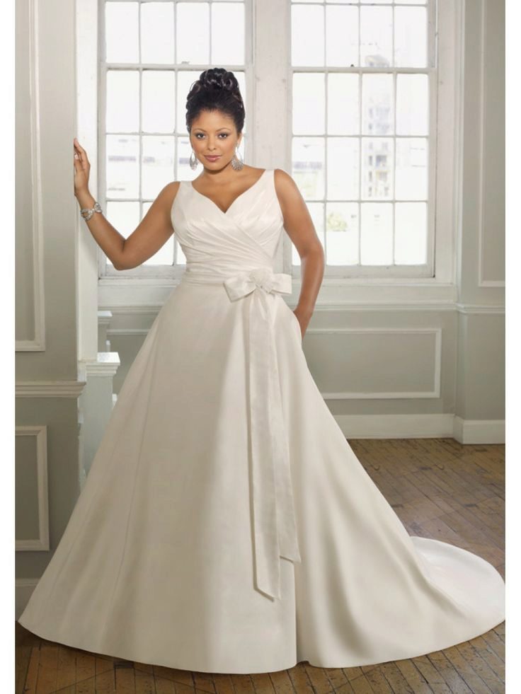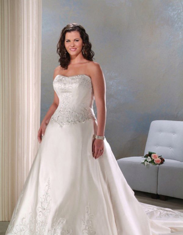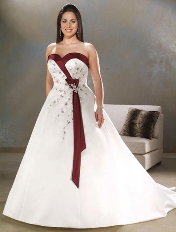 It is believed that white fills, but with proper choice of fabric and additions in the form of a colored bow or flower on the waist and using other design techniques, a white wedding dress will decorate a full bride. The basic rule for full brides is to avoid shiny fabrics that will only emphasize your roundness.
