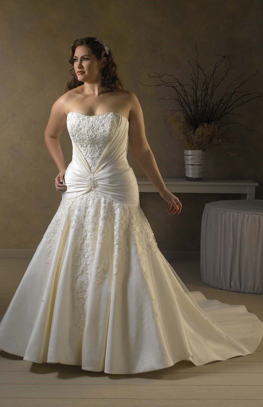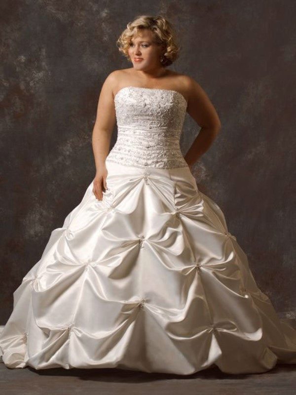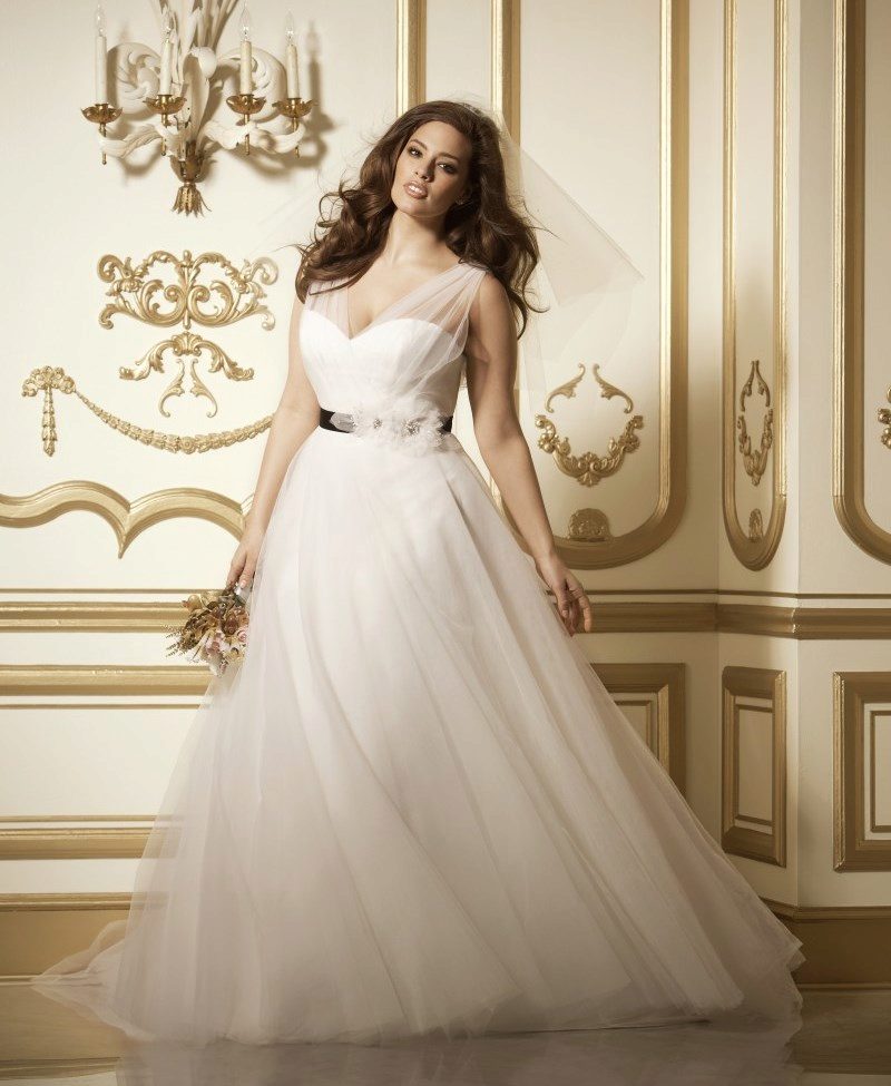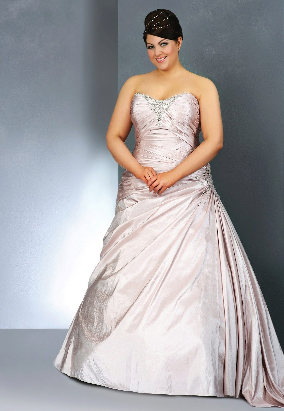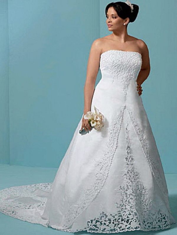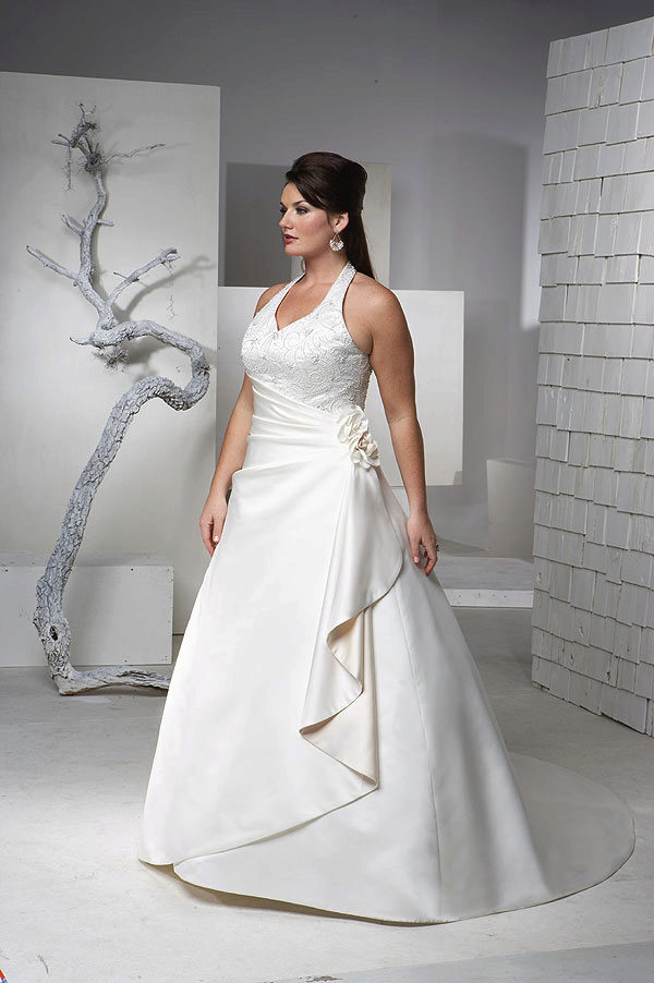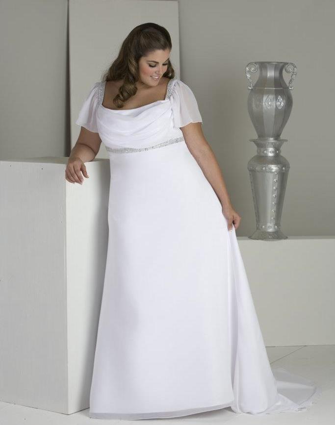It is believed that white fills, but with proper choice of fabric and additions in the form of a colored bow or flower on the waist and using other design techniques, a white wedding dress will decorate a full bride. The basic rule for full brides is to avoid shiny fabrics that will only emphasize your roundness.