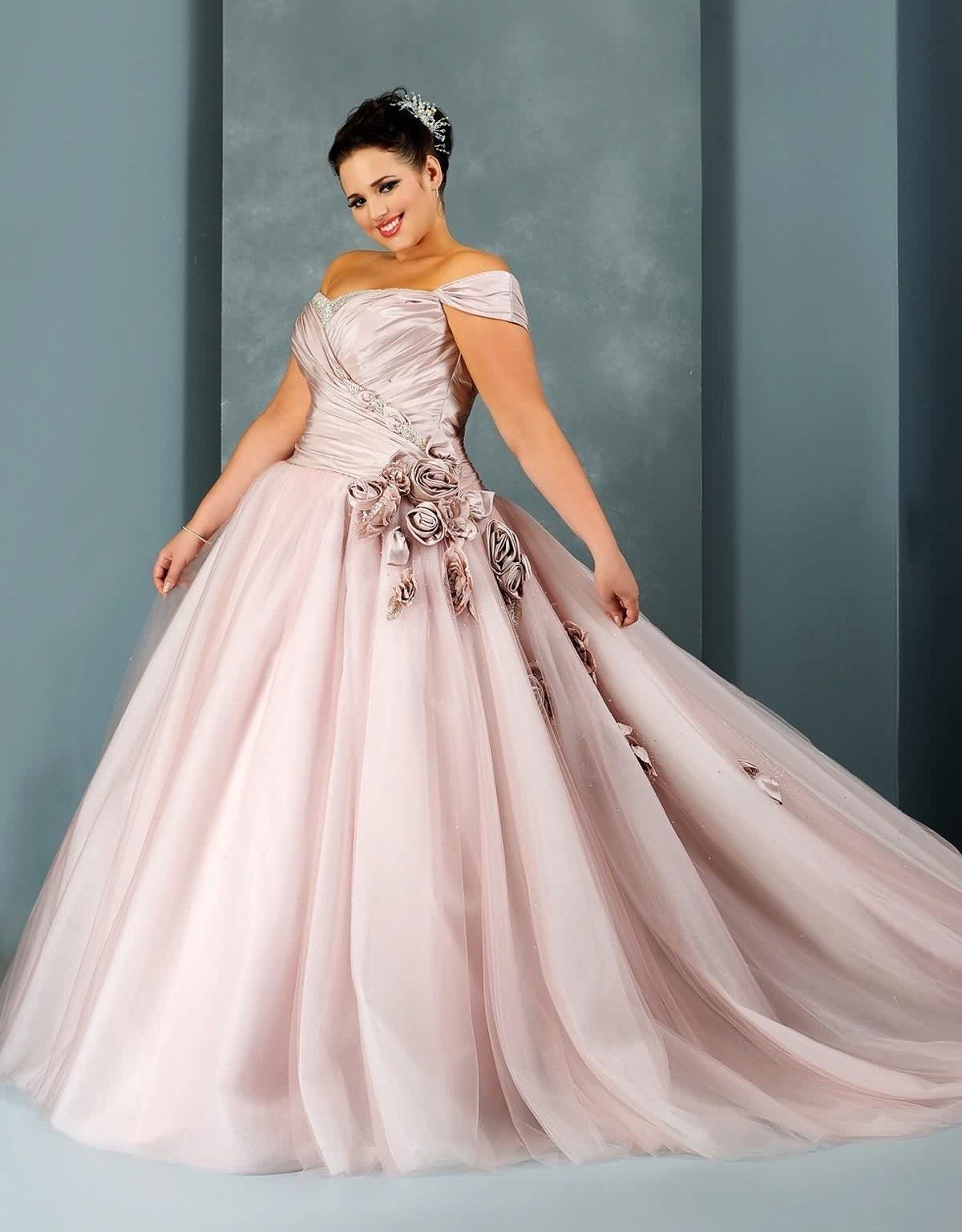 White color, traditional for a wedding dress, has a lot of shades. Most likely for full brides dresses are not snow white, but pearl, milky, smoky, cream, ivory. However, many couturiers in their collections generally refuse the white color of the wedding dress, preferring the delicate pastel tones of other colors.