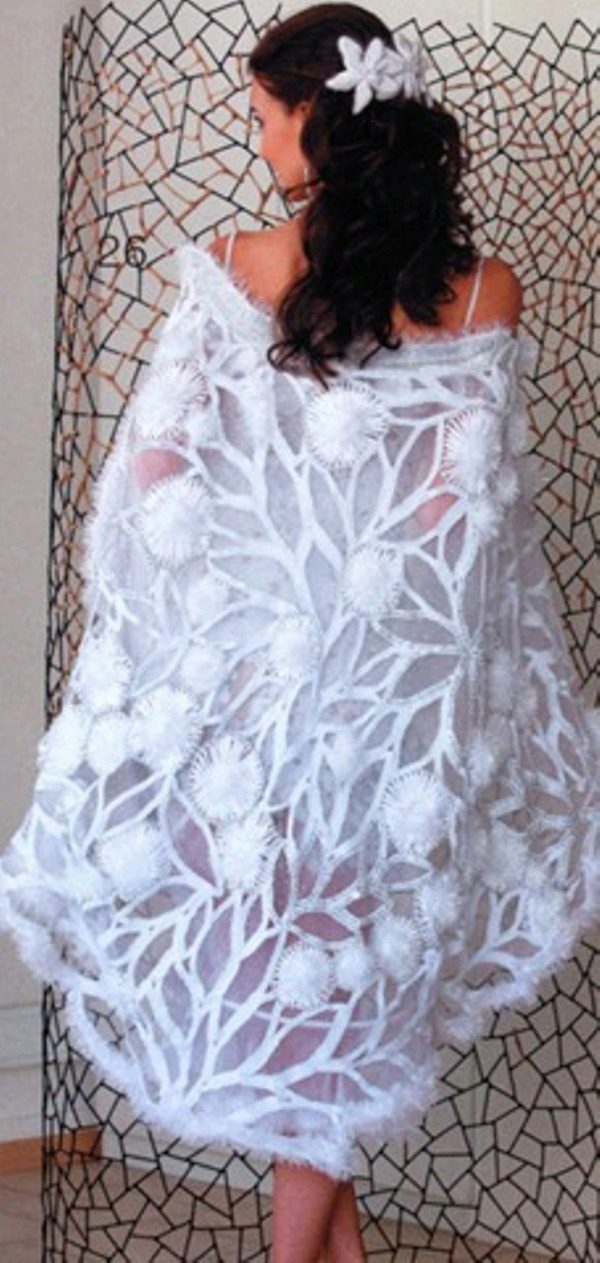 The cape for a wedding dress or in this case a skirt is unusual in that it is made of tulle pieces that are crocheted. Therefore, it is very light, even airy and looks tender.