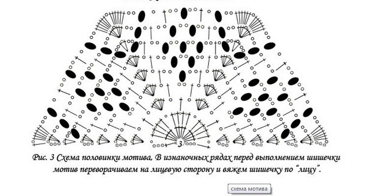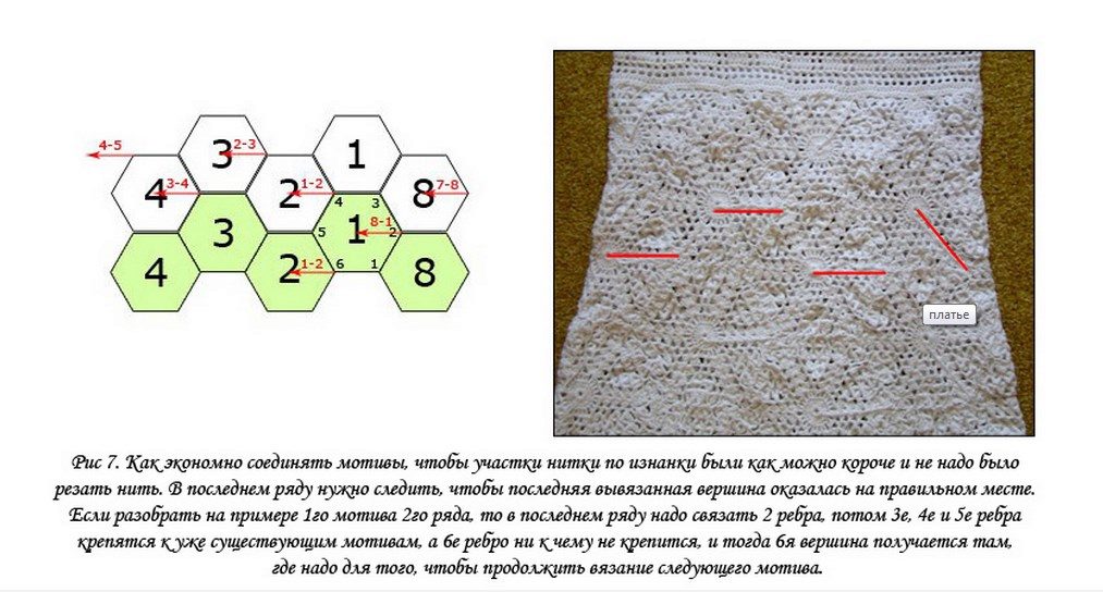 For the top of the skirt you need to tie 8 motifs, ending with the 2nd row of cones, and connect into a circle. You also need to connect and connect 4 half-part motive with 1 first row, for evenness of the edge. Knitting continue according to the distribution of rows.
