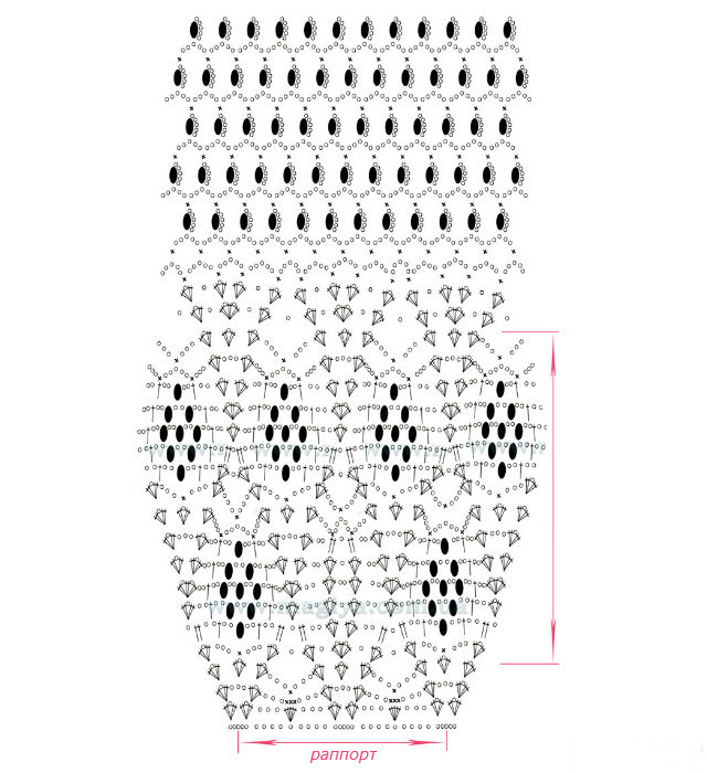 To skirt smoothly expanded at the bottom, the upper element knit up to 1 or 2 rows of cones. The motives of the subsequent rows gradually increase and only on the last rows they knit completely.