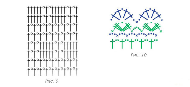Tie the crochet No. 2 crochet the top row of the skirt with crochet. Continue to knit the bodice in a checkerboard pattern (Fig. 9). Bind the neckline and the neckline with a lace pattern (Fig.10).