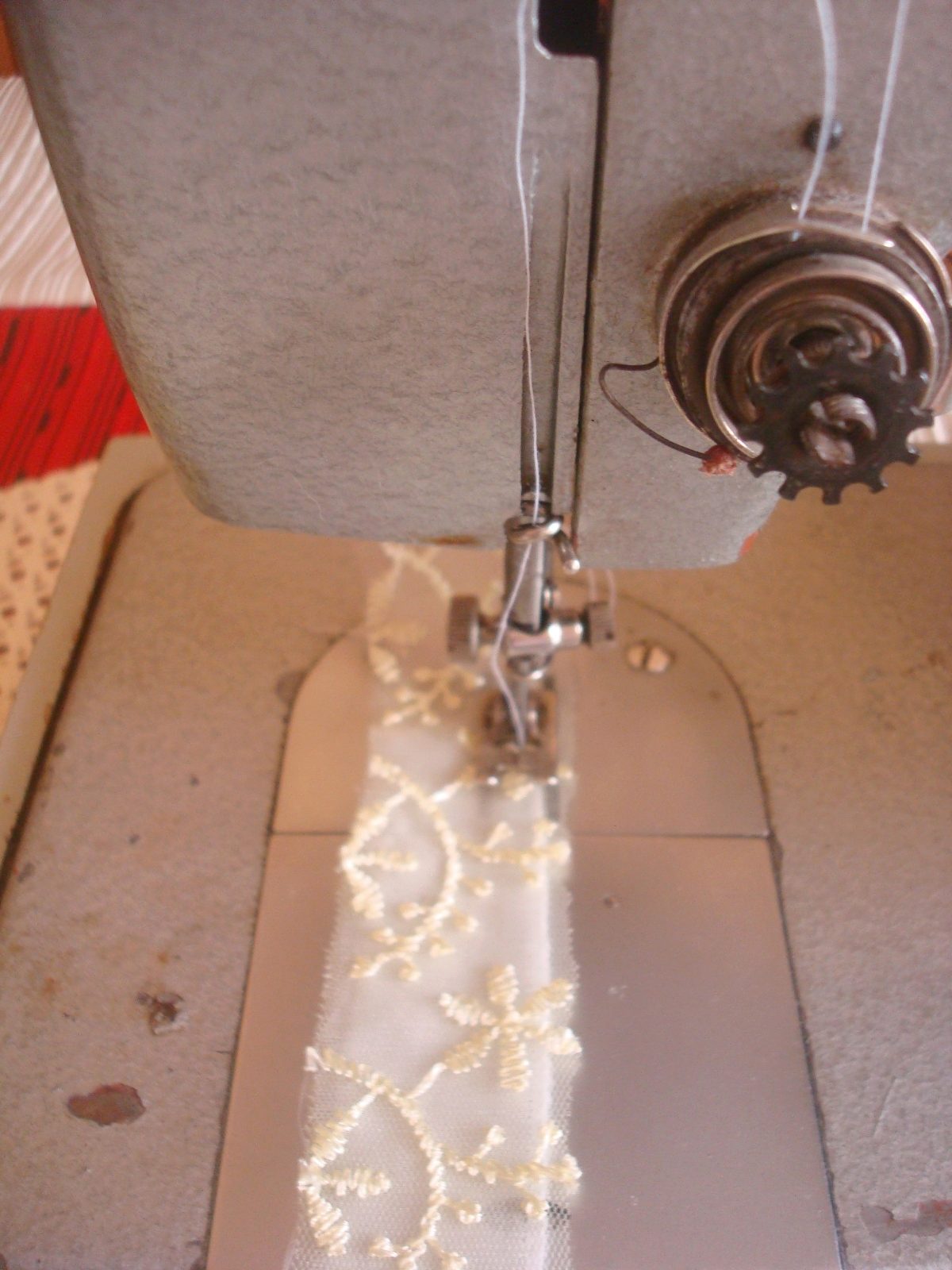 - Sweep the details of the straps of lace fabric and organza. Fold a lace fabric inside the fold and sew. Remove the strap and iron the seams. Sew the second shoulder strap. Baste them to the shoulder cut the front of the bodice.