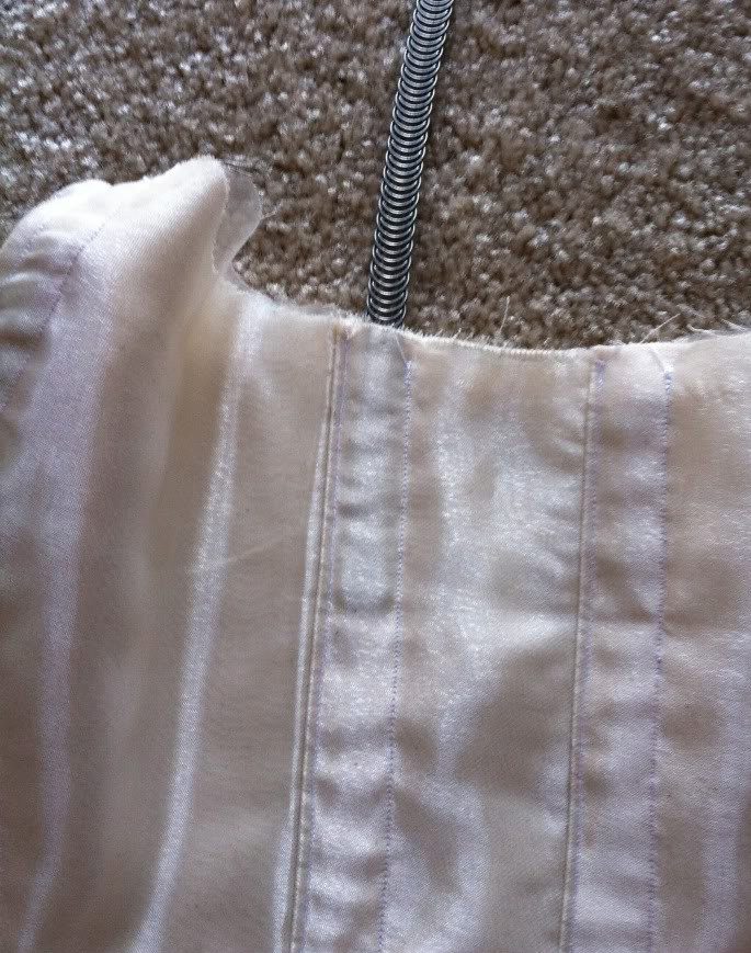 - Perform relief and side seams on the details of the satin bodice front. Iron seams.Pin the stitching of organza backs over the embossed and side seams onto the outer part and sew on both sides at a distance of 5 mm from the seam.