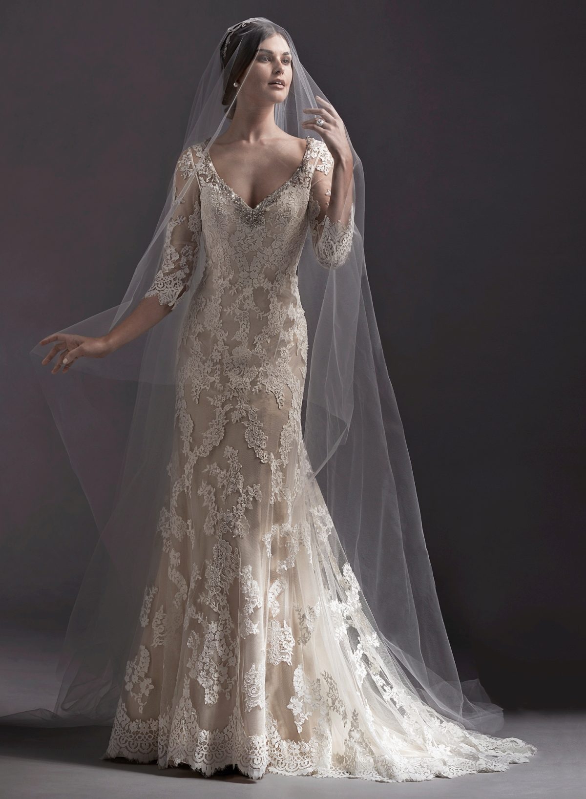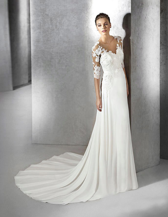The most appropriate in this style will be a long sleeve or three quarters. Noble and modest in such a dress, you will appear before your future husband.