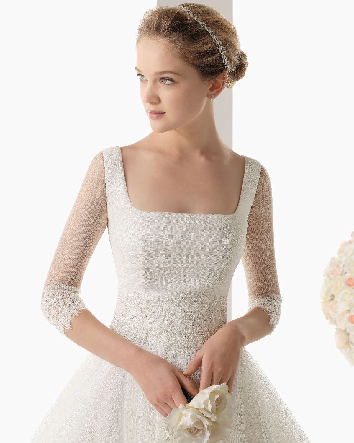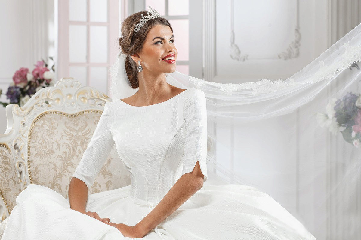 A modest dress with sleeves and closed shoulders always has a refined and elegant look. Therefore, if a wedding dress with open shoulders for some reason does not fit, then you can choose a model with 3/4 sleeves, long or short.