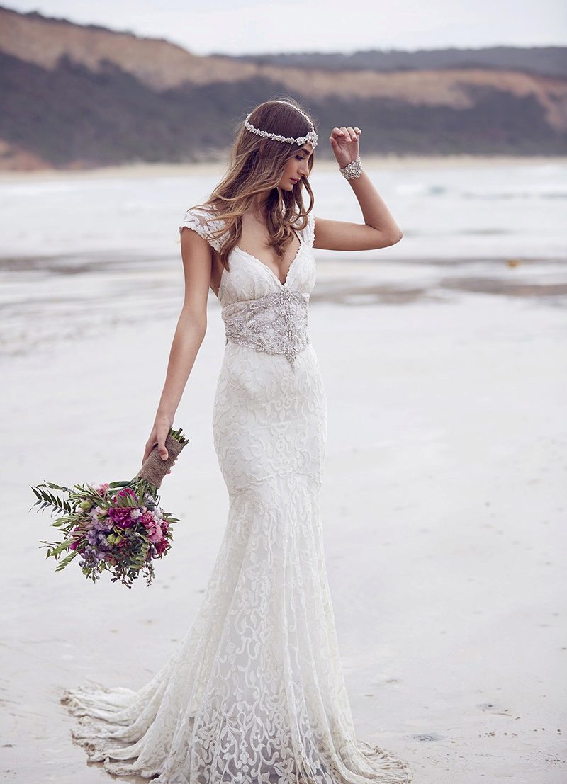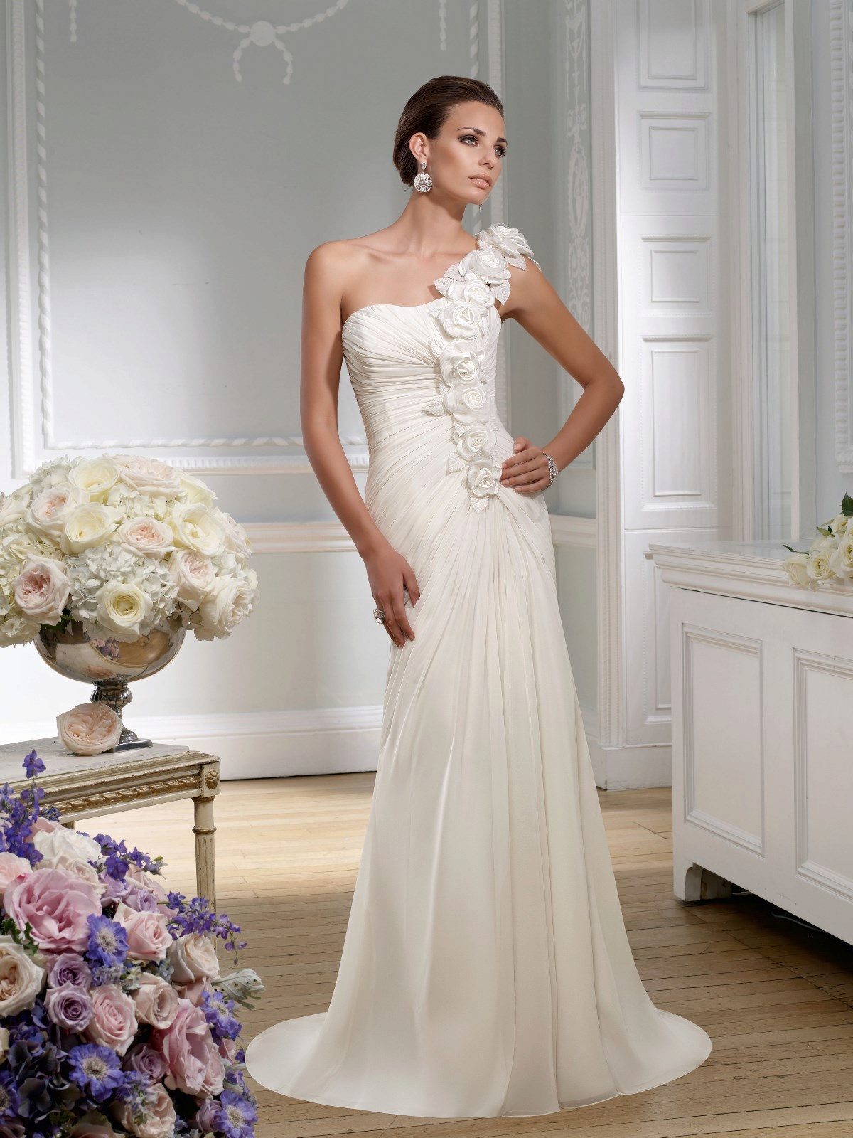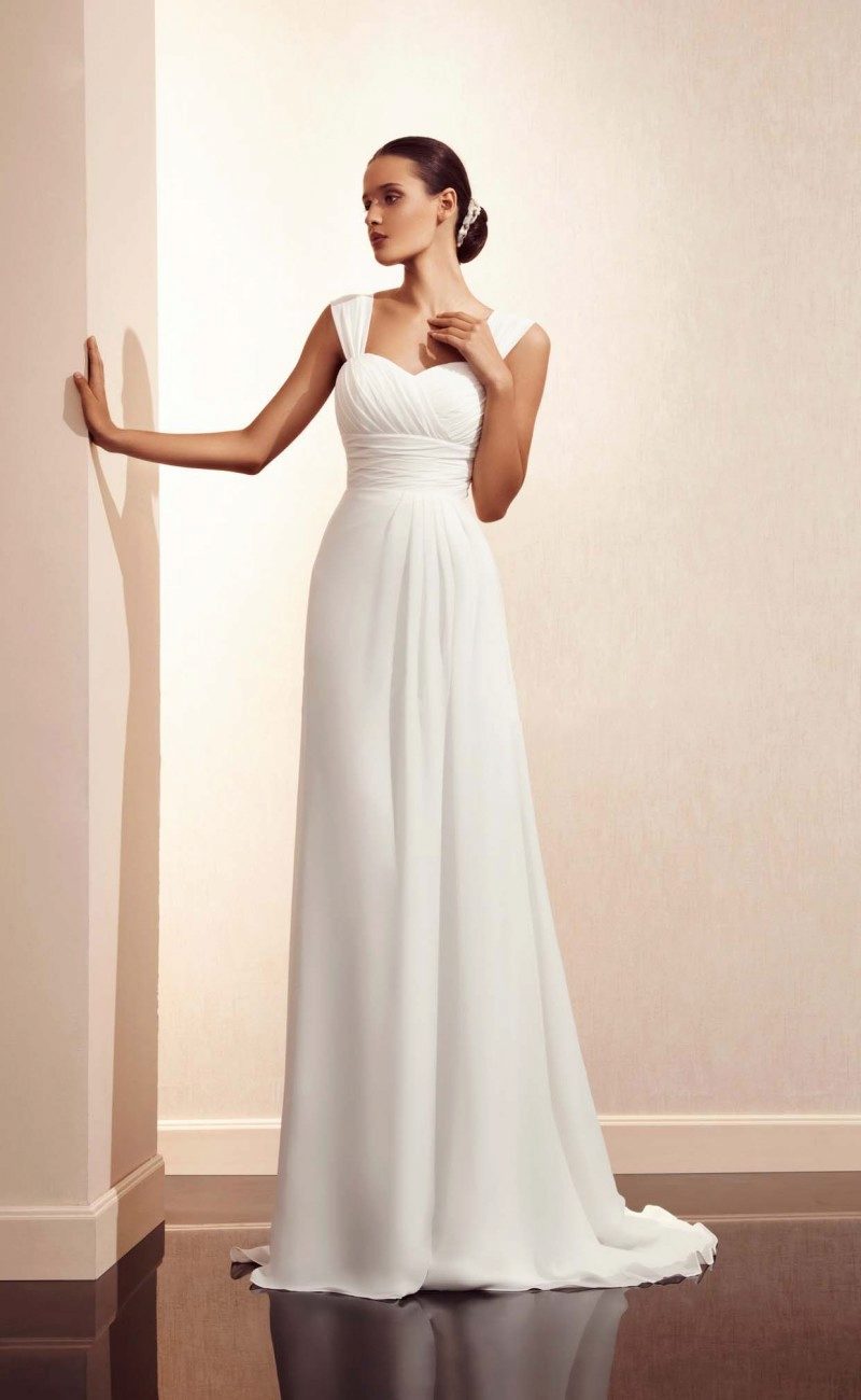 This season in the first place are the models with one wide strap, asymmetrical bottom and the most high waist. Bare shoulders excrete chest, focusing attention on this part of the female body. Since the lightweight fabrics are the main ones that are chosen for Greek dresses, the image of the bride is gentle, sophisticated and very feminine.