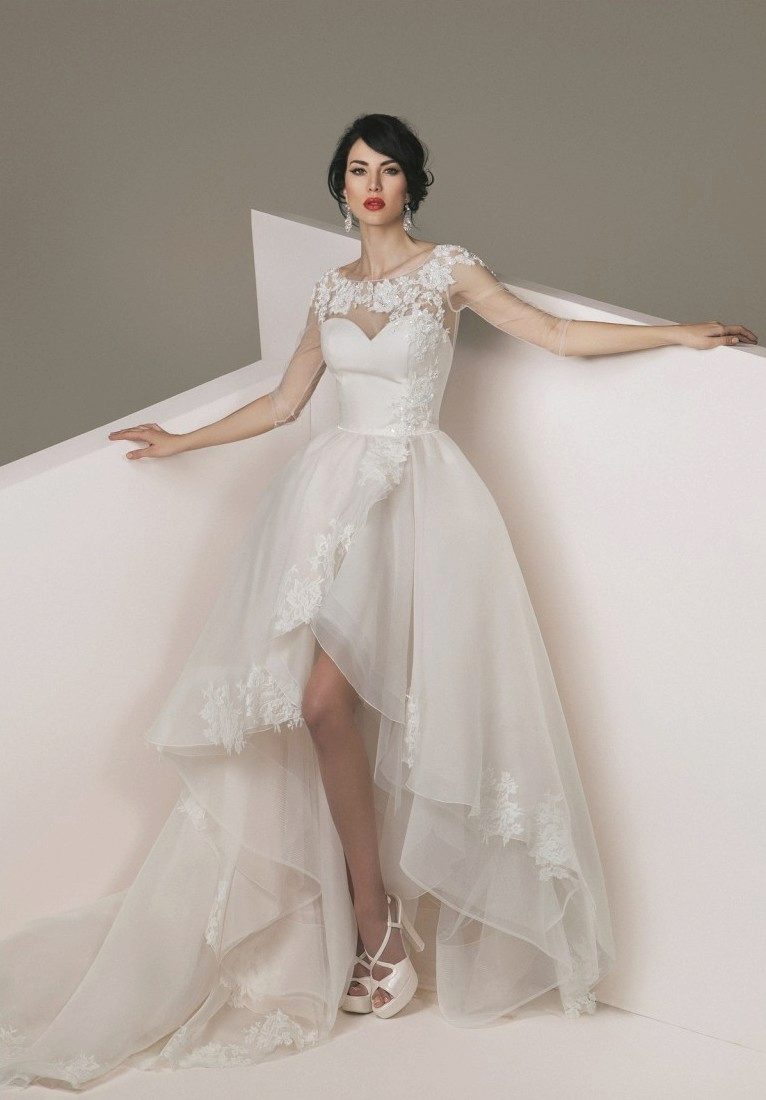 Not always a wedding dress with a train should be long. If the bride has a good figure, then why hide it under the fabric. You can choose a short dress in front and elongated due to the loop behind.