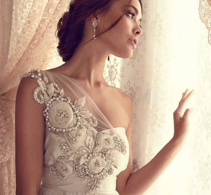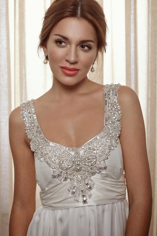 An example of the decor of the bodice and belts with stones, rhinestones and sequins can be the "Gossamer" collection of Australian designer Anna Campbell.