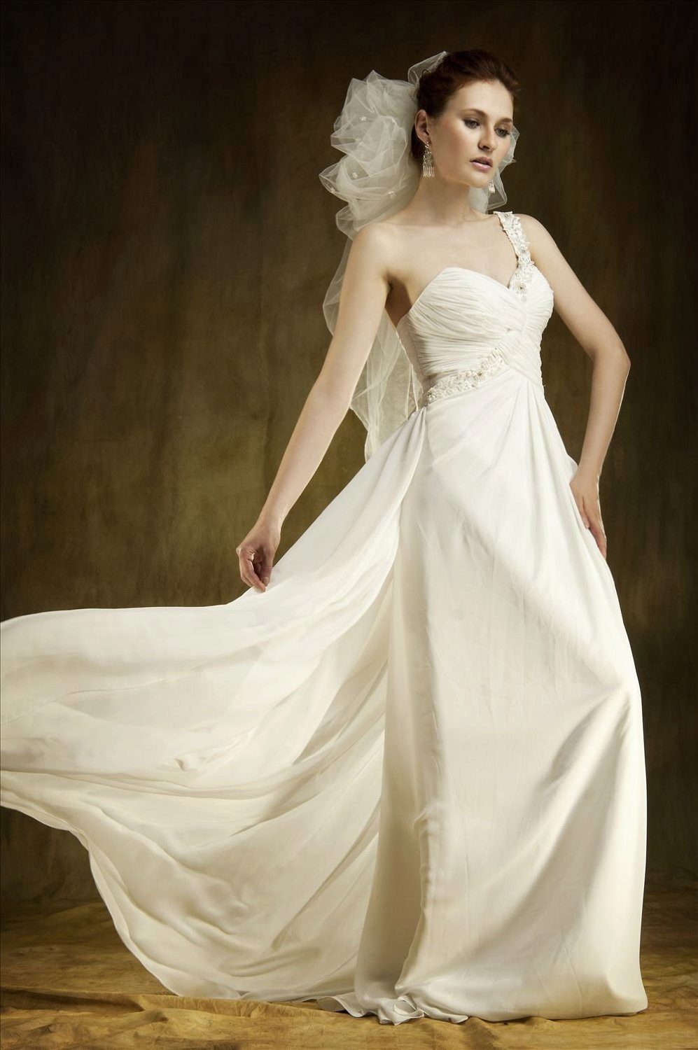 - Despite the simple cut, the Empire style wedding dress provides ample opportunities for decoration. Particular attention should be paid to the belt under the breast. It is often decorated with all sorts of decorative elements that are at the height of fashion in this particular season. Thanks to the imagination of designers, the bride seems to be something like a graceful antique nymph who came to us from another world, where harmony, beauty and serenity reigns.