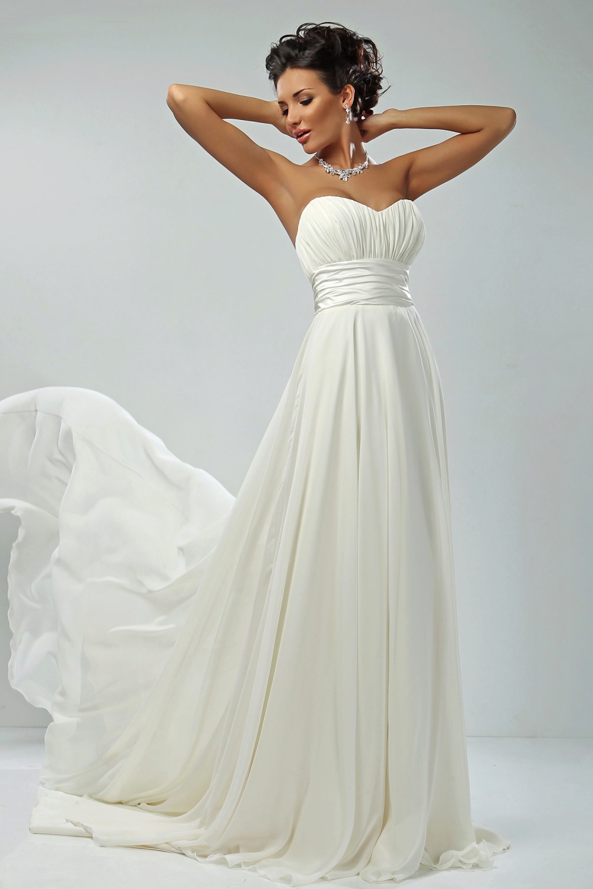 It should be said that an empire wedding dress is best suited for a summer wedding. It is not hot, because there are no tight corsets and puffy skirts. The free cut of the lower part and the open top do not hinder the circulation of air, moreover, the fabrics from which such dresses are made are light, almost weightless.