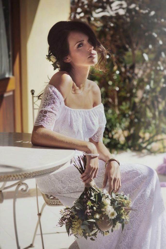 Focus on the area of the chest should be due to the V-shaped cuts or boat-cuts. And another distinctive feature for hippy brides is long sleeves.
