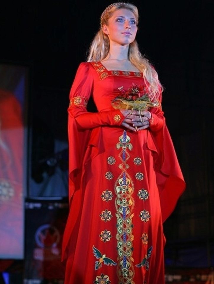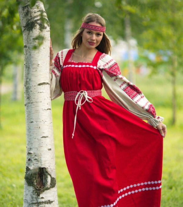 - More consistent scarlet dress, decorated with colorful embroidery. The model can be in the Empire style and A-shaped or style that fits the figure.