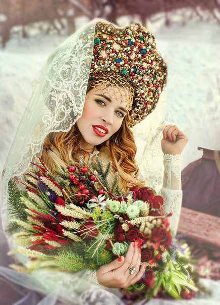- A veil with many tiers is a very interesting detail of the Russian style. It will be well combined with a wreath of flowers or an extraordinary hoop.