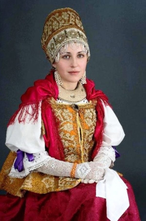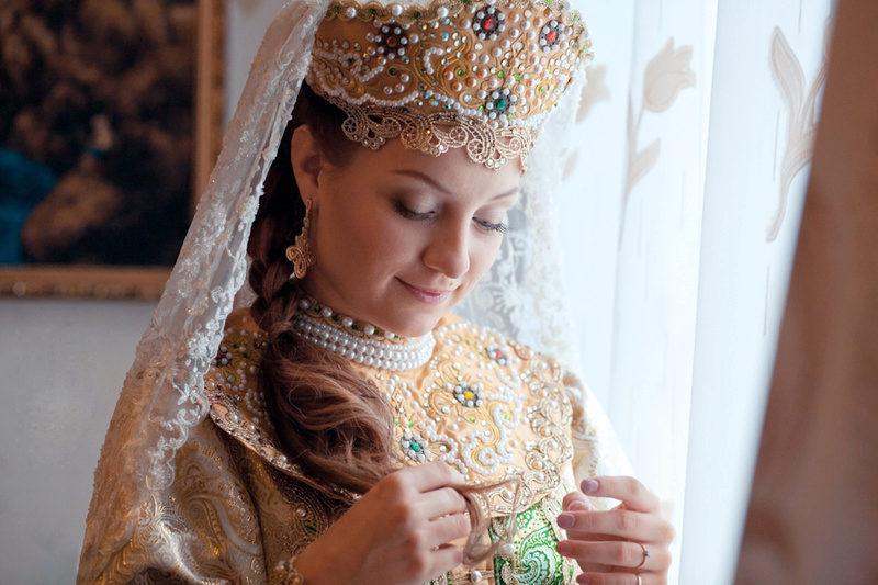 Initially, the girl wore a shirt with ornaments, embroidered with her own hands. A sundress, as bright as a shirt, was an indicator of how skilled a craftswoman is a bride. He was also an indicator of the welfare of her parents. The luxurious brocade mantle, decorated with pearls, was a sign that the bride was of a princely family.