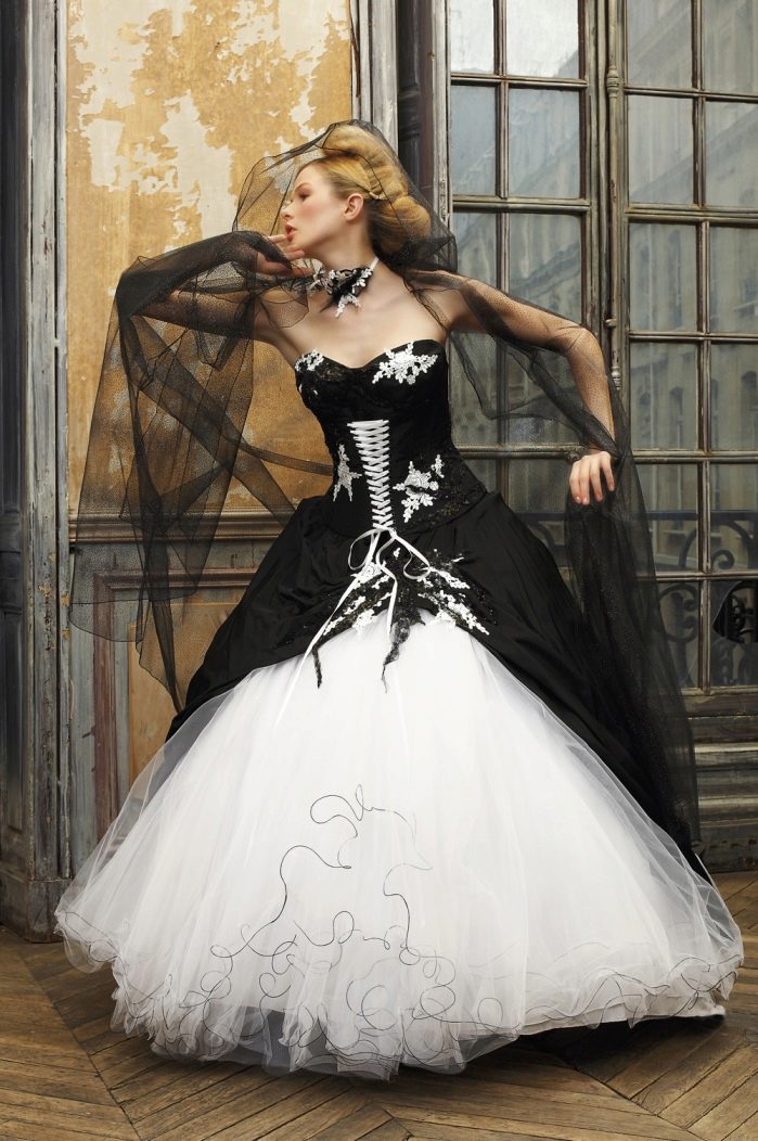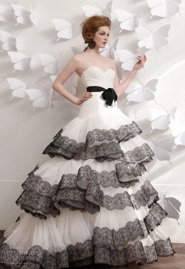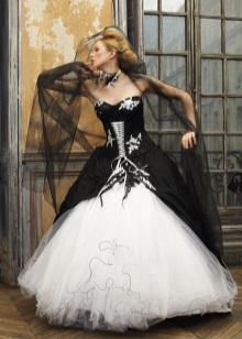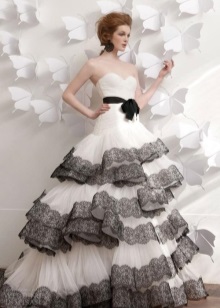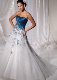 The optimal solution for those who chose a traditional wedding dress, but wants to add originality to it, can be decorative elements of a different color. This may be a tied belt, trim on the bottom of the dress or colored elements on the corset. But in this case, the color scheme should be chosen under the suit of the groom and the overall decoration of the wedding celebration.