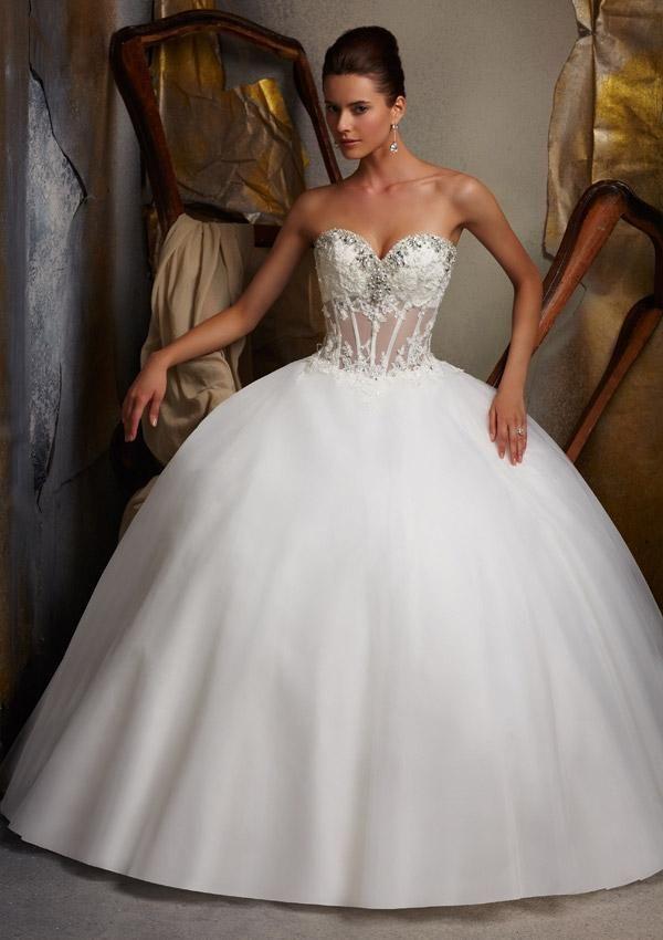 Pre-fitting will help you choose the right pattern on a transparent corset, which will advantageously emphasize the girl's figure. Such a corset, embroidered with rhinestones, pearls and stones, will make the image of the bride dazzling in the literal and figurative sense. Delicate lace, in turn, will add femininity and romance to the wedding dress.