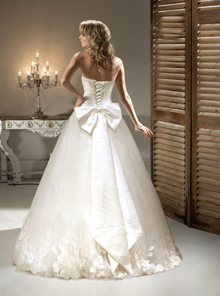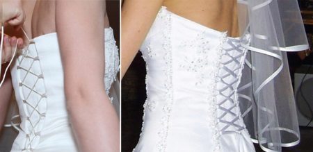 For tying the wedding dress is usually used satin ribbons, silk braid or a special lace made of cotton.