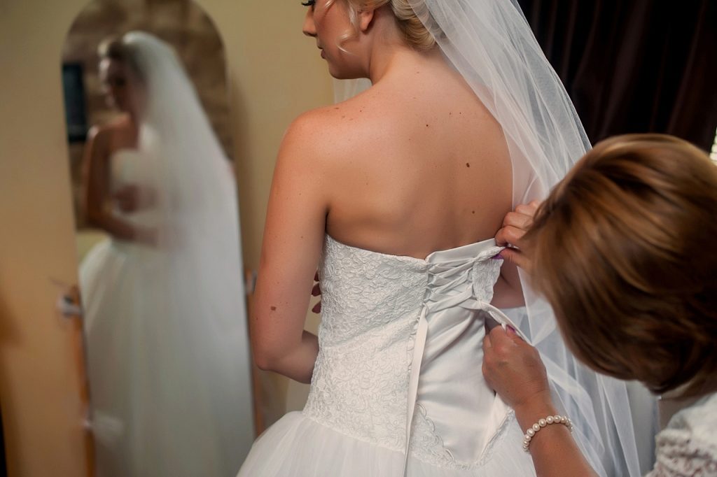 It is necessary to lace a corset when the girl has already put on a dress on herself. That is why it is not possible to lace the corset yourself without any help. During the lacing of the corset, the bride needs to hold her chest with both hands so that she will not flatten her in the process of tying.