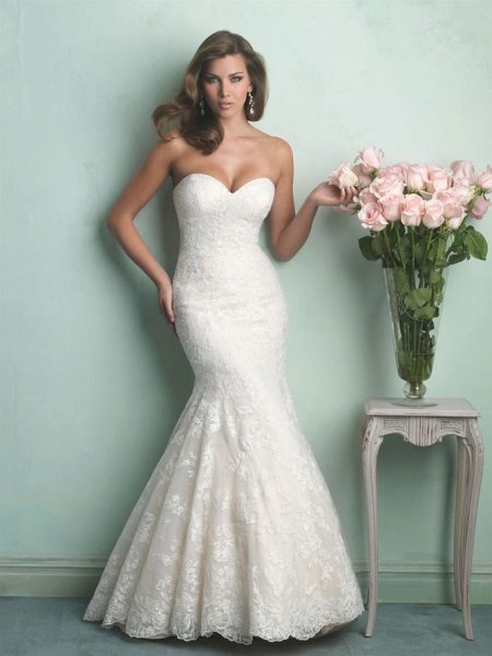 Another attractive model of a wedding dress with a corset can be called a mermaid dress. This style of dress is characterized by a tight-fitting silhouette and a fluffy skirt from the line of the knees. This dress will suit girls only with a slender figure, otherwise the wedding dress will look extremely careless on the bride.