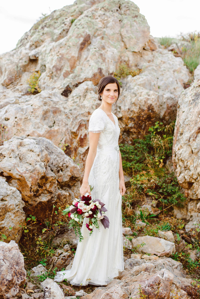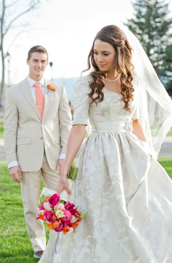 Ideally, the wedding dress should be long sleeved, but short ones are acceptable. You can also use long gloves.
