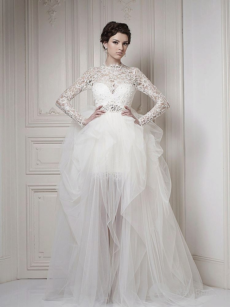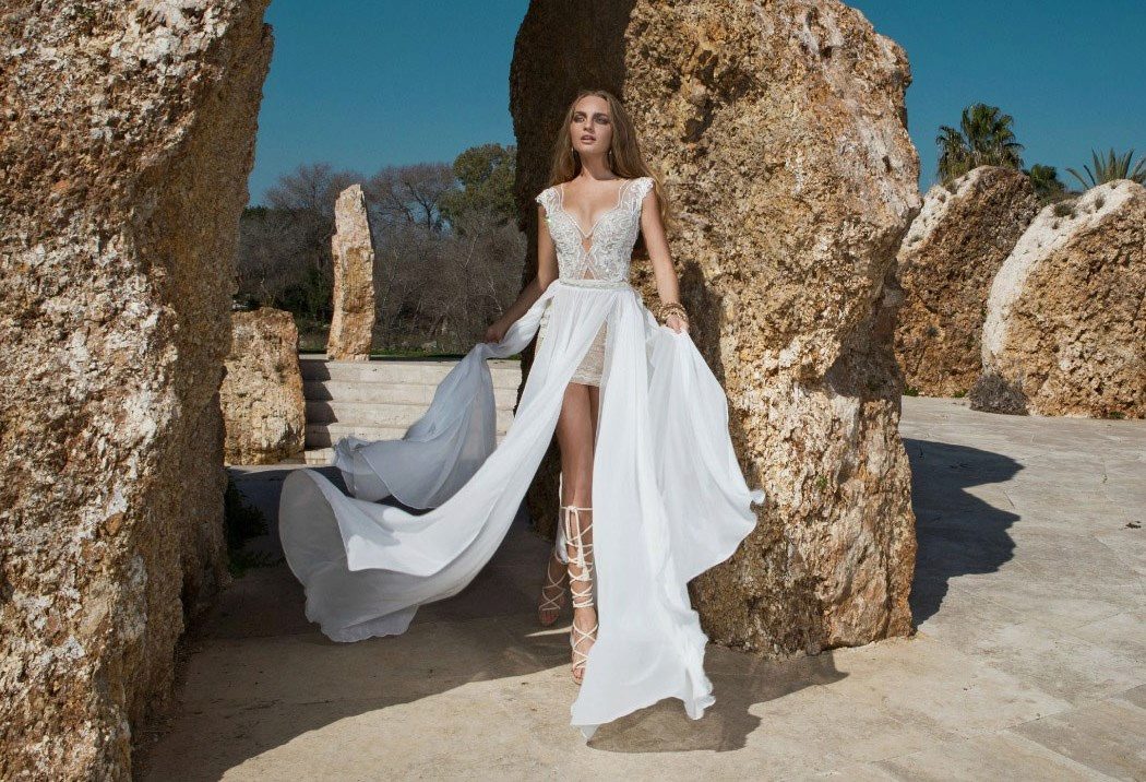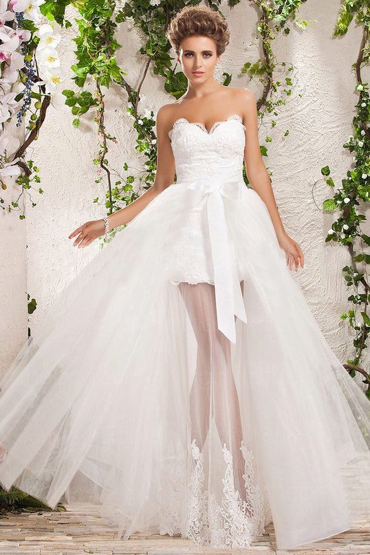 The long-beloved version of a wedding dress with a train hiding a short length, once again conquers the podiums. This solution is ideal for those who dream of short dresses, but can not yet decide on it. A detachable tulle skirt is worn on top of the dress, smoothly turning into a train. On the one hand, the legs will be open, and on the other, they will nevertheless be covered like a veil.